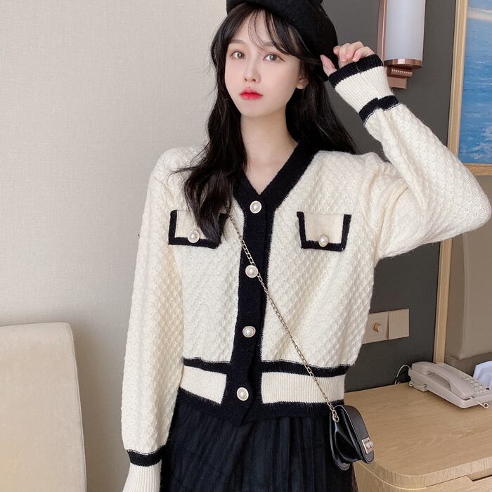 ワッフル素材のカーディガンに、モノトーンカラーのラインがスタイリッシュに引き締めてくれています。