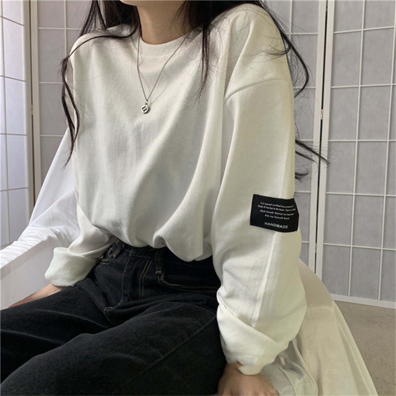 肘タグ トップス Tシャツ カットソー 長袖 シンプル カジュアル おしゃれ かっこいい こなれ感 ラフ メンズライク 男女兼用 通勤 通学 旅行 M L XL 2XL 白 ホワイト 黒 ブラック AS10068