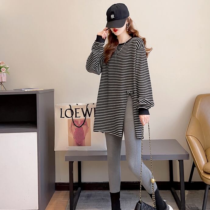 ビッグスリット トップス Tシャツ カットソー ロング丈 長袖 シンプル お洒落 ラフ メンズライク ボーイッシュ スポーティー ボーダー ストライプ 通勤 通学 運動 ヨガ アウトドア 着回し M L XL 白 ホワイト 黒 ブラック AS10070