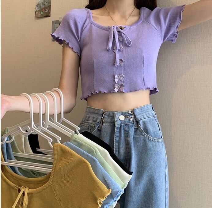 ニット 半袖 Tシャツ トップス シャツ カットソー ニットソー プルオーバー 白トップス ミニ ミニ丈 ショート ショート丈 半袖 フレアスリーブ ラウンドネック スリム タイト 細身 リボン かわいい 大人可愛い シンプル カジュアル おしゃれ かっこいい こなれ感 ラフ ラブリー キュート 個性的 存在感 抜け感 無地 夏 10代 20代 レディース 学生 デート お出かけ 女子会 休日 着回し 普段使い 重ね着 モテ 色展開 白 ホワイト 黒 ブラック 青 ブルー 緑 グリーン 紫 パープル 黄色