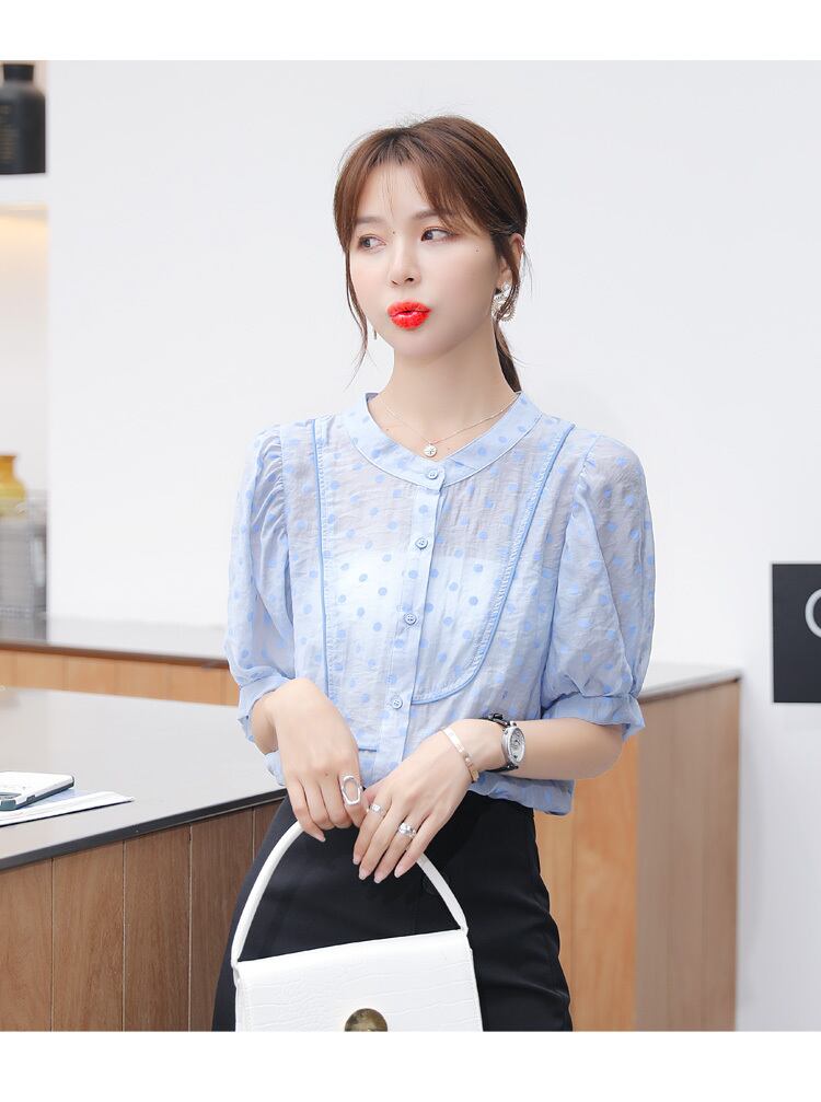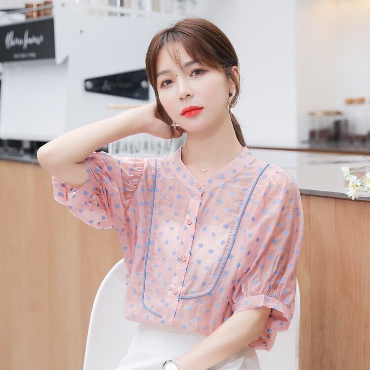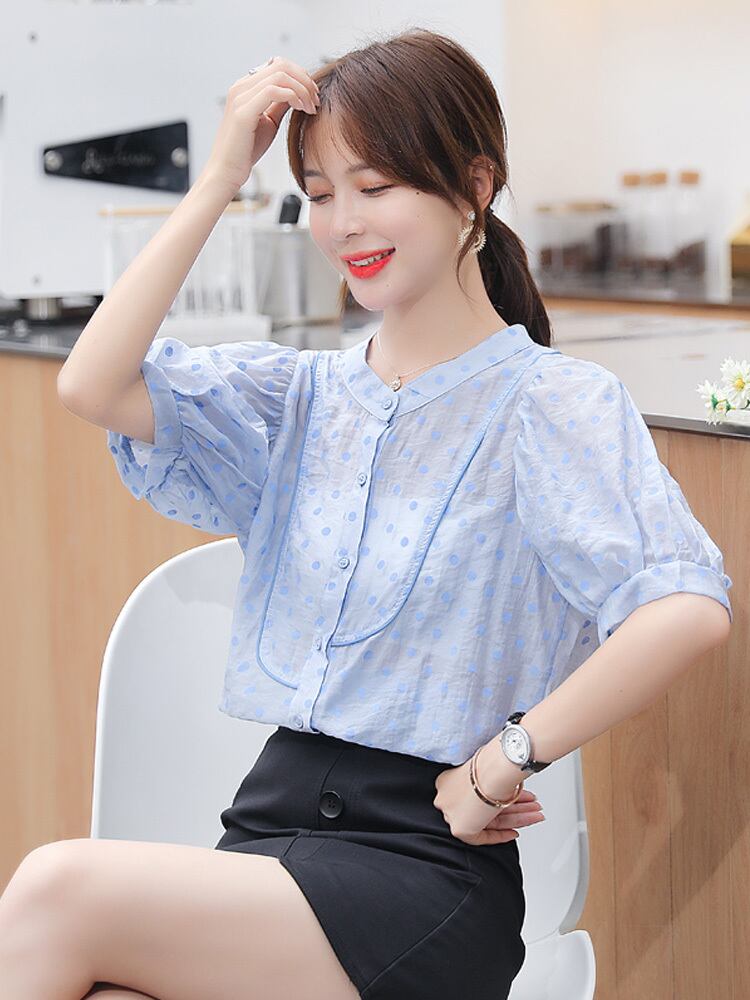 トップス ブラウス 袖あり 5分袖 五分袖 ボリューム袖 パフスリーブ Uネック ラウンドネック 襟なし スリム 細身 スマート 着やせ シフォン 前開き 透け感 シースルー コントラスト かわいい 大人可愛い カジュアル おしゃれ レトロ アジアン こなれ感 ラブリー キュート ヴィンテージ ヨーロッパ風 ドット柄 水玉 10代 20代 レディース 女性用 オフィス ビジネス OL 通勤 学生 通学 デート お出かけ 休日 着回し 普段使い 重ね着 韓国 ファッション コーデ スタイル ブルー ピンク