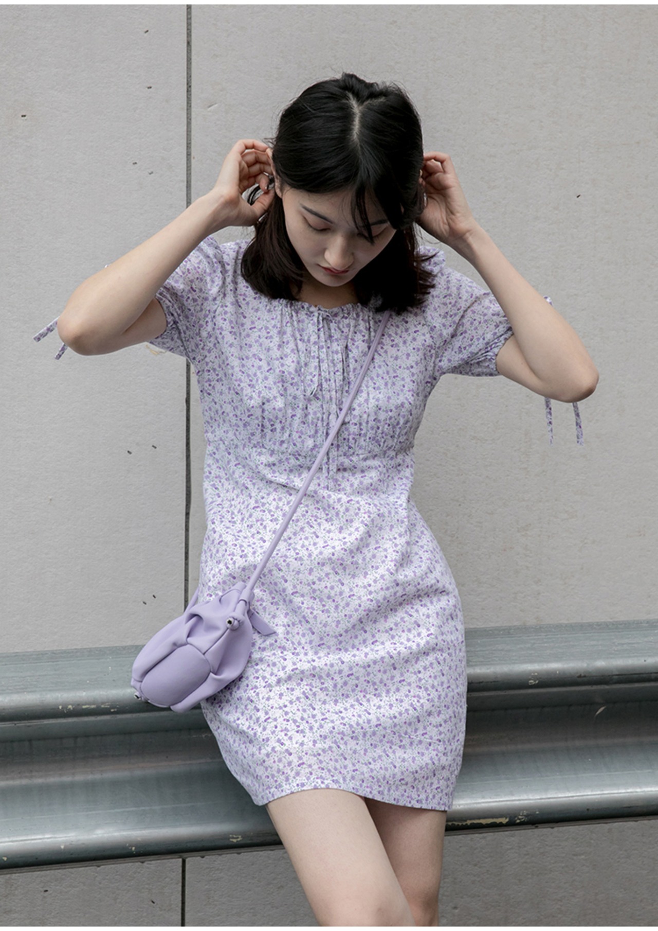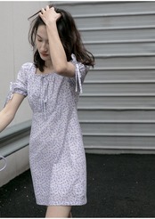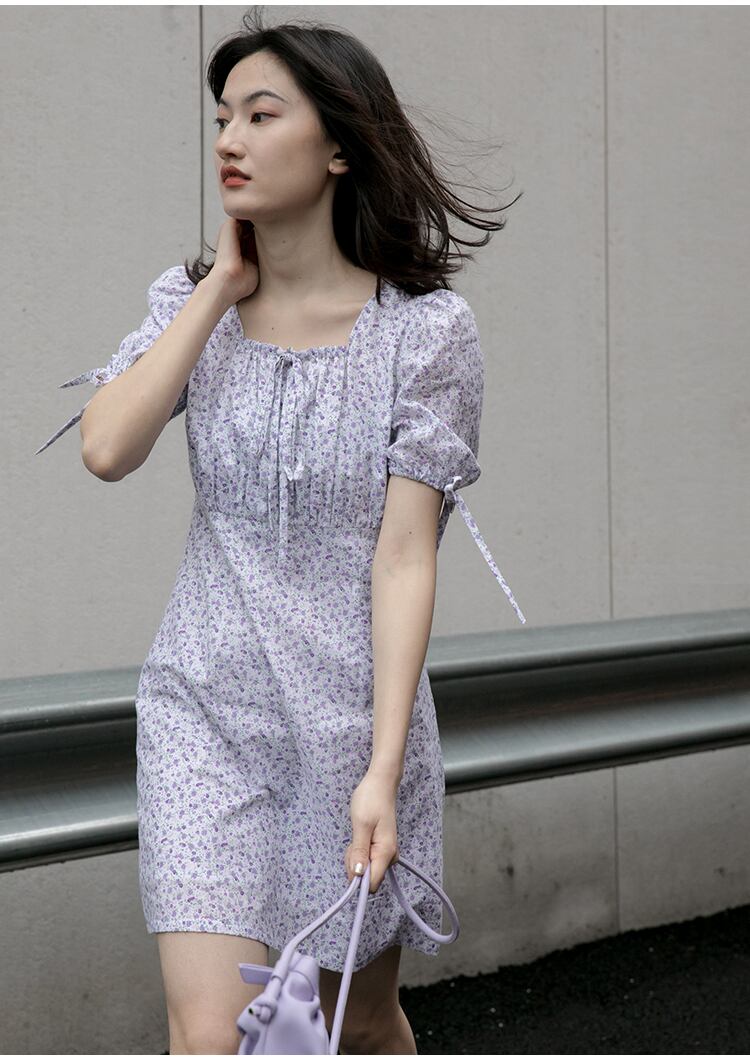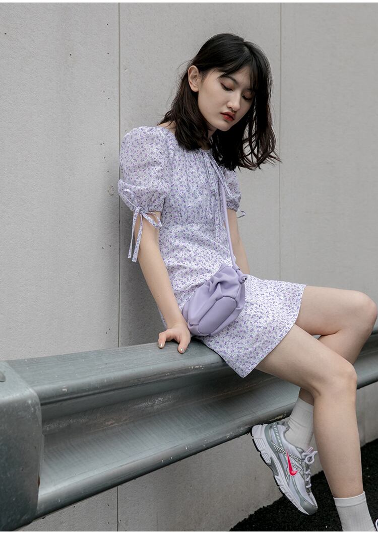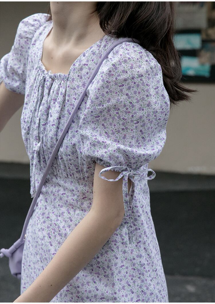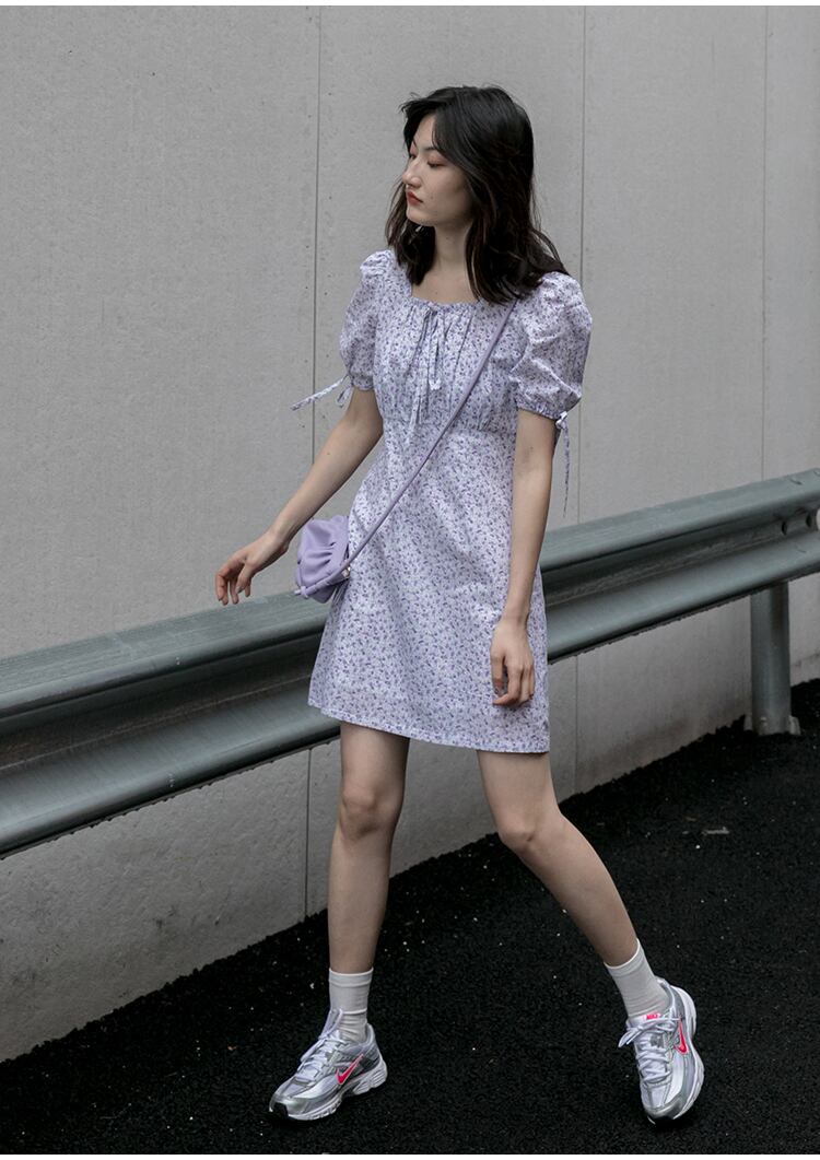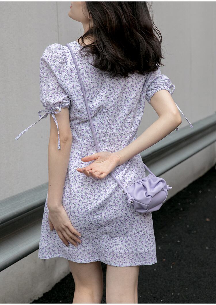 小さなパープルの花柄がガーリーで女の子っぽくかわいい印象のミニ丈のワンピース。