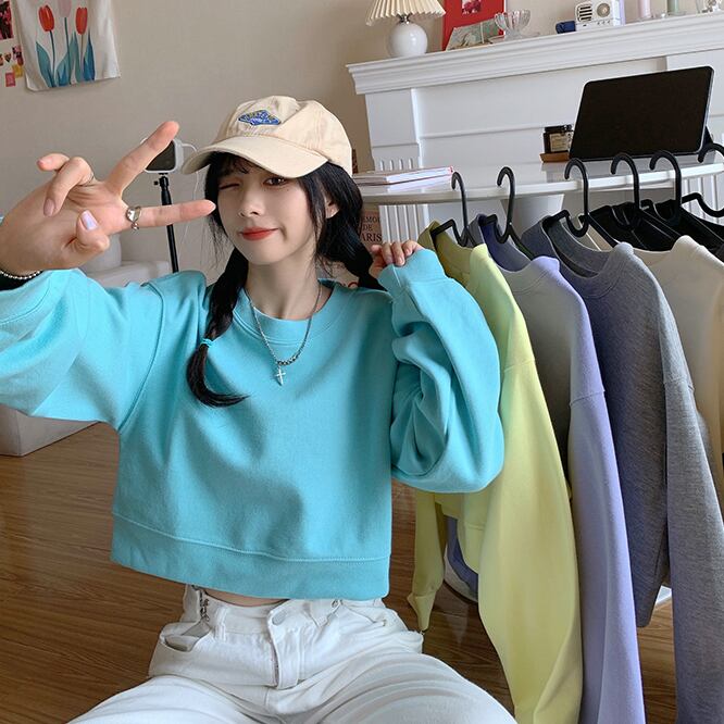 トップス プルオーバー トレーナー スウェット ショート丈 長袖 かわいい シンプル おしゃれ ラフ キュート ガーリー ルーズ 運動 ジム アウトドア 韓国系 ファッション 楽ちん 体系カバー S M L 黒 ブラック 青 ブルー 灰色 グレー 黄色 イエロー アイボリー AS10074