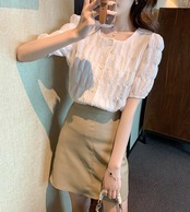 パフスリーブの五分丈で気になる二の腕もうまくカバーできる優れものです。