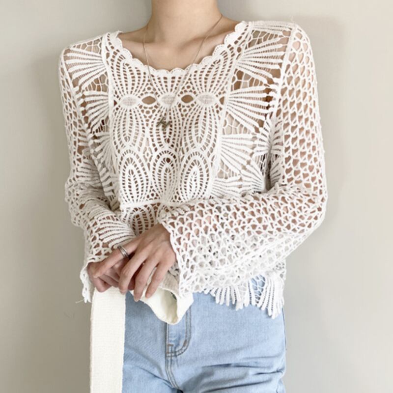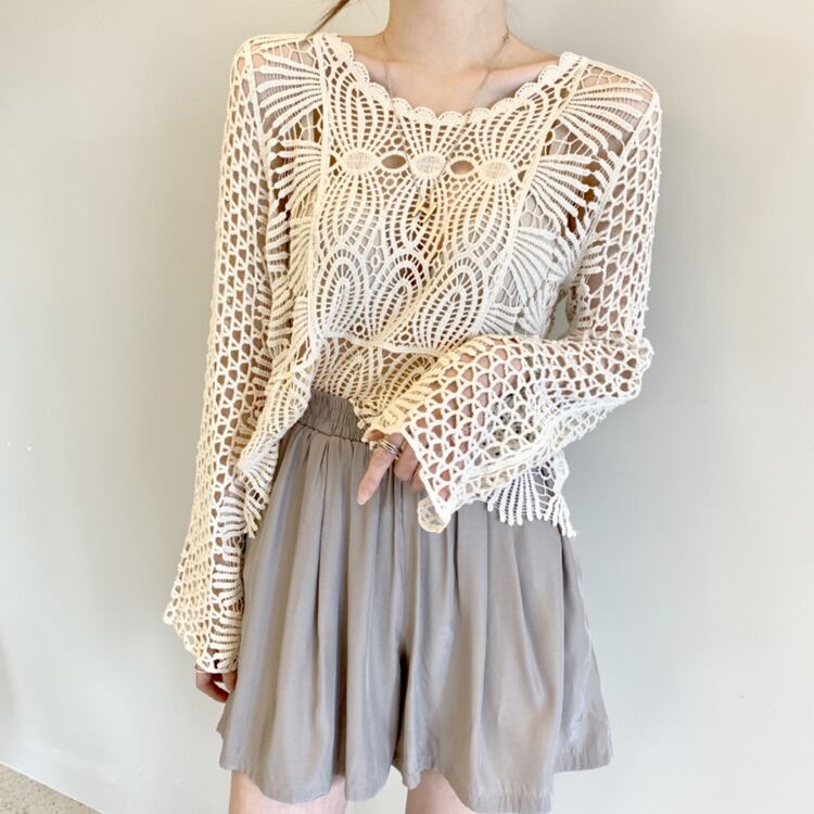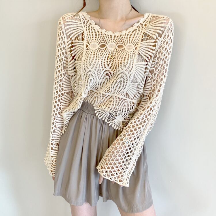 トップス シャツ 白トップス 袖あり 長袖 萌袖 Uネック ラウンドネック 襟なし スリム タイト 細身 スマート 着やせ レース 刺繍 かわいい 大人可愛い シンプル カジュアル 大人 おしゃれ レトロ アジアン こなれ感 ラフ メンズライク モダン 主役級 抜け感 柄 花柄 フラワー 春 夏 10代 20代 デート お出かけ 休日 着回し 普段使い 重ね着 ファッション コーデ スタイル 楽ちん 穴あき 体系カバー 日焼け止め フリーサイズ 白 ホワイト ニュアンスカラー アプリコット