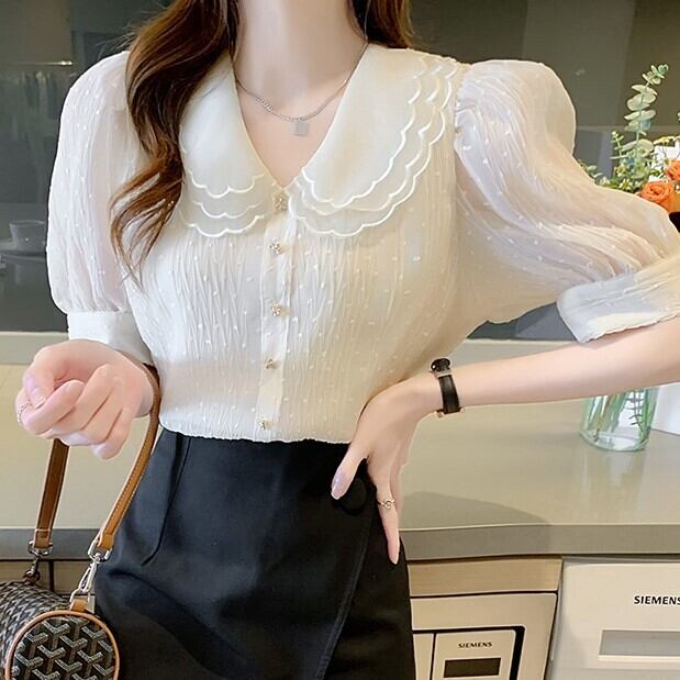 シフォン 半袖 トップス シャツ ブラウス カットソー プルオーバー 白トップス 半袖 5分袖 五分袖 襟付き レース 透け感 シースルー 薄手 かわいい 大人可愛い きれいめ シンプル 大人 上品 おしゃれ 大人女子 こなれ感 ラフ ラブリー キュート ガーリー 抜け感 無地 春 夏 10代 20代 30代 40代 レディース オフィス OL 通勤 学生 通学 デート お出かけ 女子会 休日 パーティー イベント 着回し 普段使い 重ね着 モテ サイズ S M L XL 2XL 色展開 白 ホワイト
