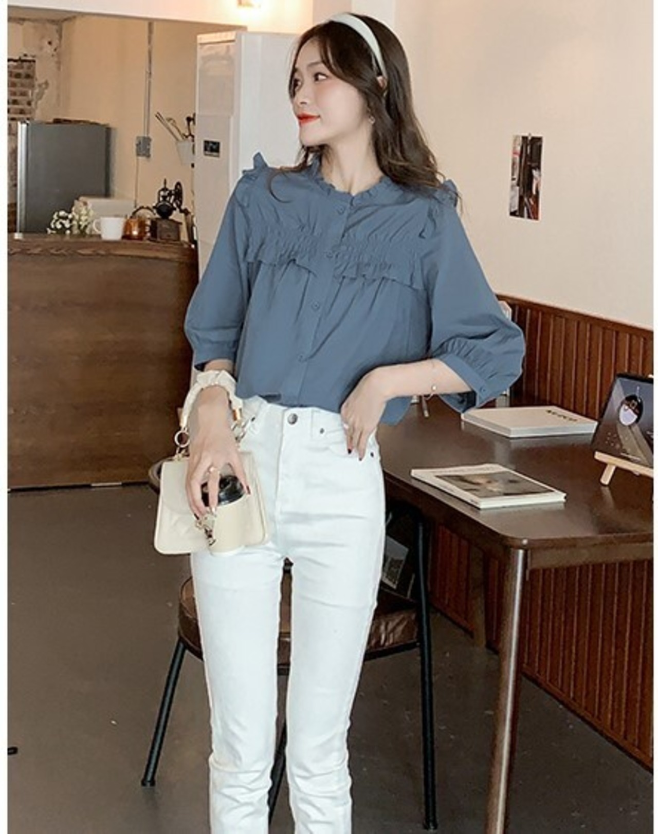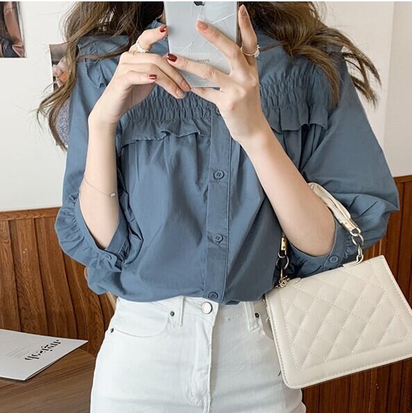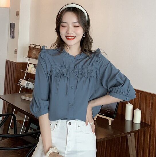フリル トップス シャツ ブラウス カットソー 半袖 5分袖 五分袖 パフスリーブ スタンドカラー ストレート 前開き 薄手 かわいい 大人可愛い きれいめ シンプル カジュアル 大人 上品 おしゃれ レトロ 大人女子 こなれ感 ラフ ラブリー キュート ガーリー ルーズ 存在感 抜け感 無地 春 夏 10代 20代 30代 レディース ママ オフィス OL 通勤 学生 通学 デート お出かけ 公園デビュー 女子会 休日 着回し 普段使い 重ね着 モテ サイズ S M L XL 2XL 色展開 青 ブルー