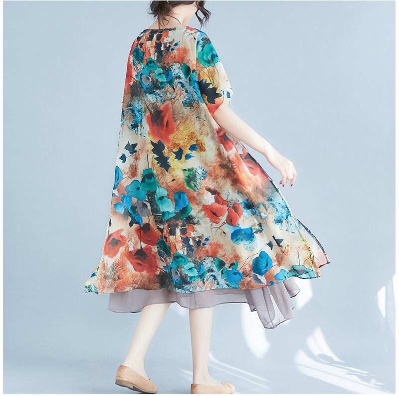 柄 プリント ワンピース プルオーバー ロングスカート フレアワンピース ワンピドレス 膝下 ミモレ ミモレ丈 ロング ロング丈 半袖 ラウンドネック フレア ワイド シフォン 透け感 大人可愛い カジュアル 大人 おしゃれ レトロ アジアン エスニック 大人女子 こなれ感 ラフ 個性的 クール モード系 存在感 抜け感 ボタニカル 夏 20代 30代 40代 レディース ママ マタニティ お出かけ 休日 着回し 普段使い 楽ちん サイズ XL 2XL 3XL 4XL 大きいサイズ ゆったり ゆる サイズ