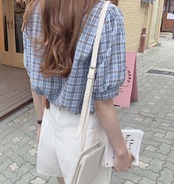 チェック柄 レトロ パフスリーブ トップス ブラウス 半袖 かわいい 上品 おしゃれ 大人可愛い キュート 通勤 通学 デート お出かけ 着回し S M L XL 青 ブルー AS10076
