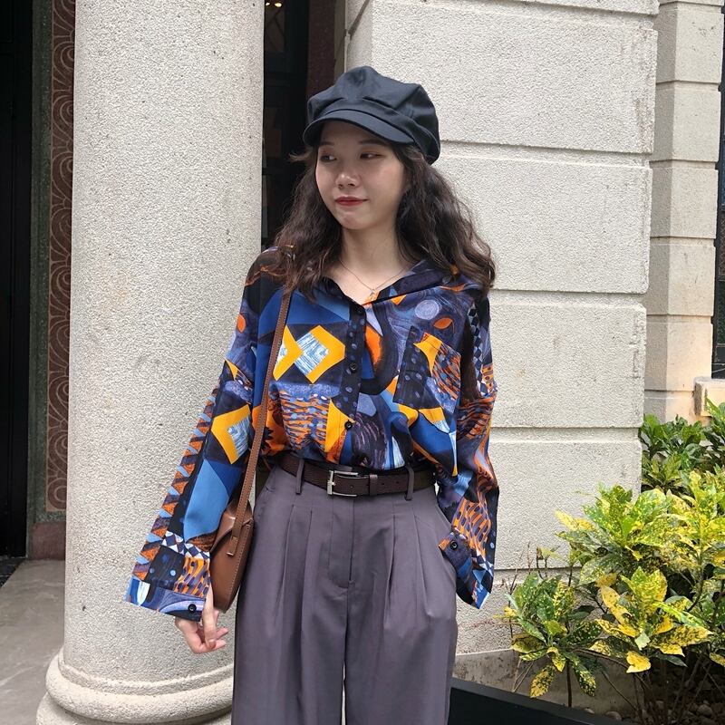 柄シャツ ネイビー 個性的シャツ 大きいサイズ 小さいサイズ トップス シャツ ブラウス ロング丈 袖あり 長袖 ボリューム袖 ドロップショルダー Vネック 襟付き 前開き ボタン オーバーサイズ かわいい カジュアル 大人 おしゃれ お洒落 かっこいい レトロ エスニック エキゾチック こなれ感 ラフ メンズライク マニッシュ ボーイッシュ ルーズ 個性的 クール モード系 存在感 シック 柄 春 秋 冬 ロングシーズン 10代 20代 レディース 女性用 学生 デート お出かけ 女子会 休日