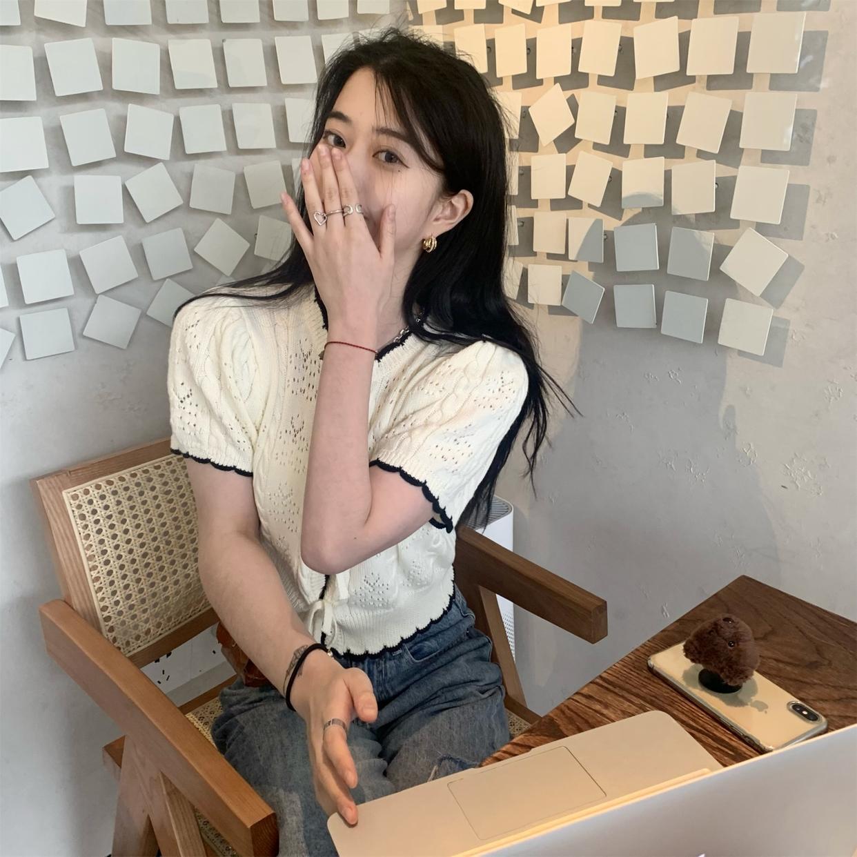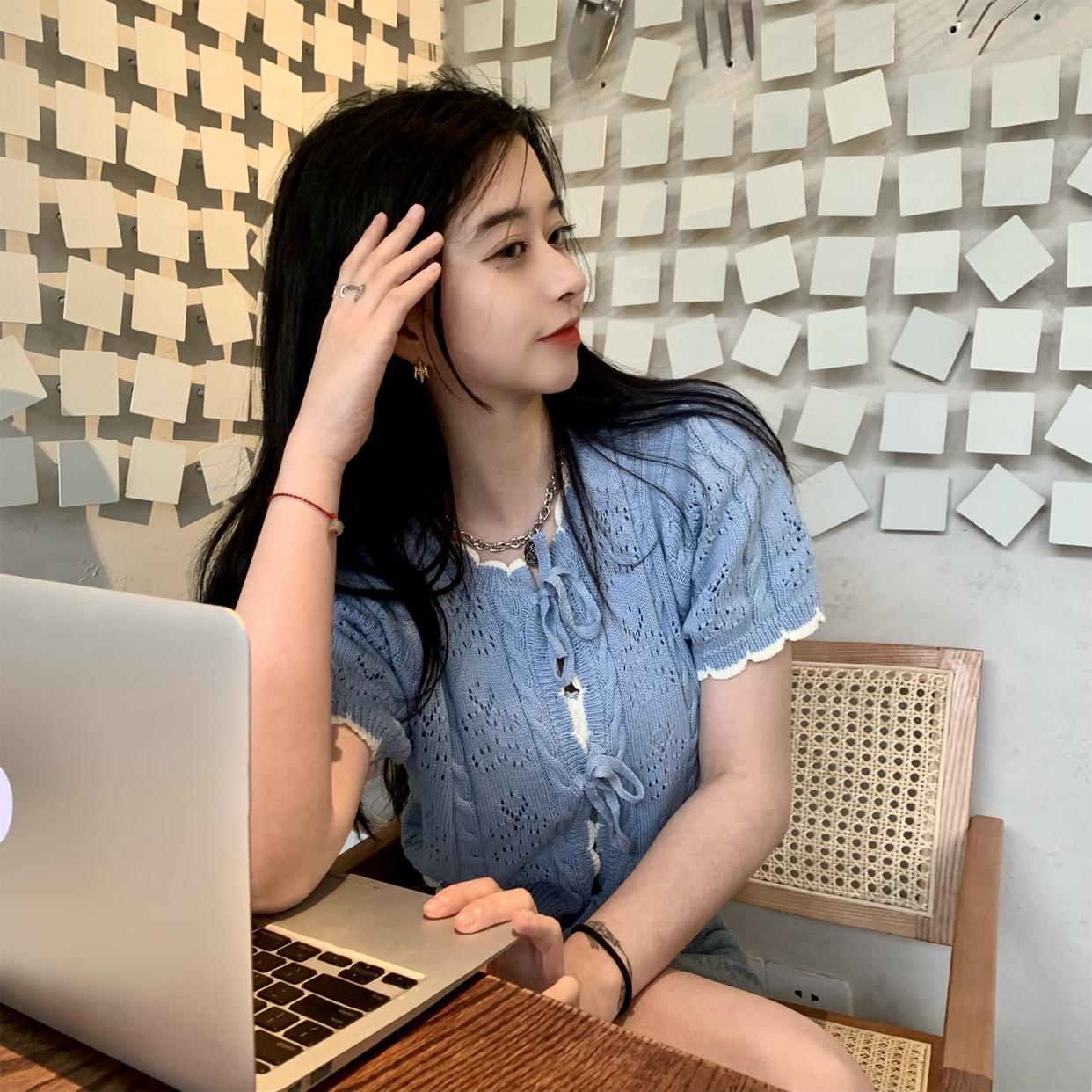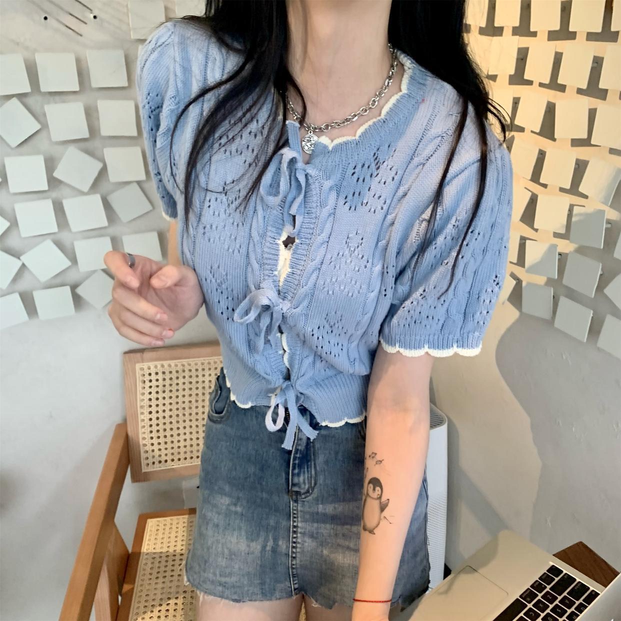 クロップド丈トップス リボントップス ライトブルー アプリコット トップス シャツ カーディガン 羽織り ショート ショート丈 クロップド丈 袖あり 半袖 ラウンドネック 襟なし リボン かわいい きれいめ 上品 おしゃれ お洒落 清楚 ラブリー キュート ガーリー 存在感 爽やか 無地 春 夏 ロングシーズン 10代 20代 レディース 女性用 女の子 学生 デート お出かけ 女子会 休日 アウトドア イベント 旅行 お茶会 ランチ ショッピング 着回し 普段使い 重ね着 韓国 韓国系 オルチャン