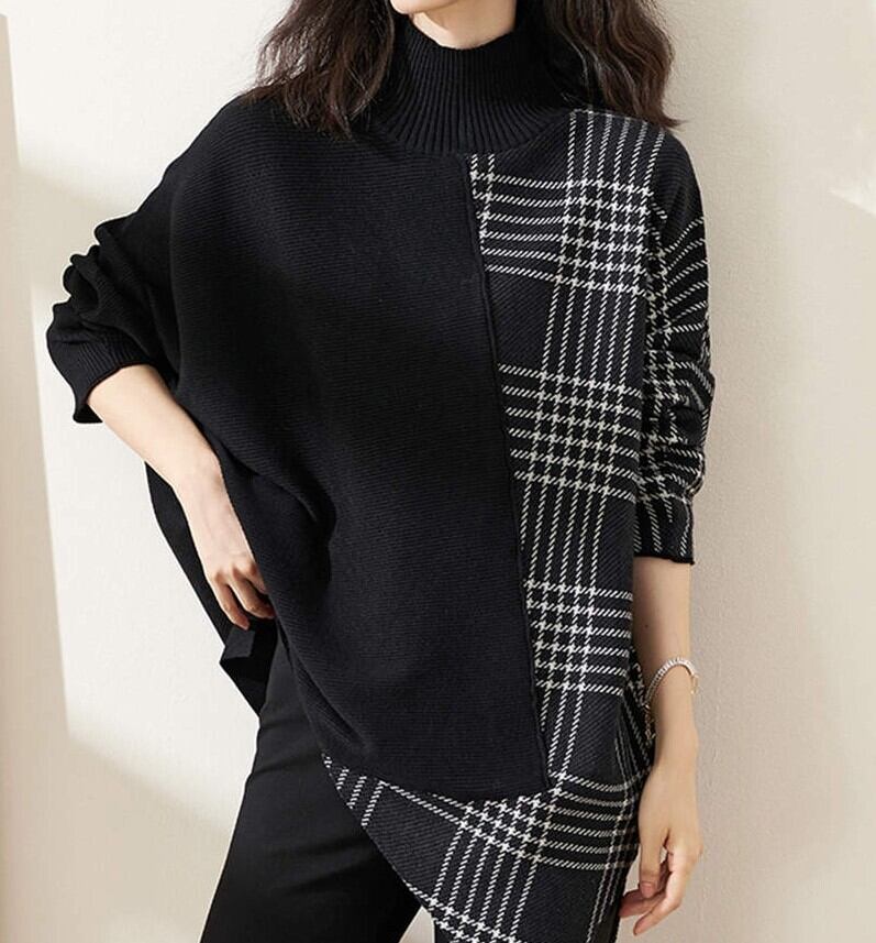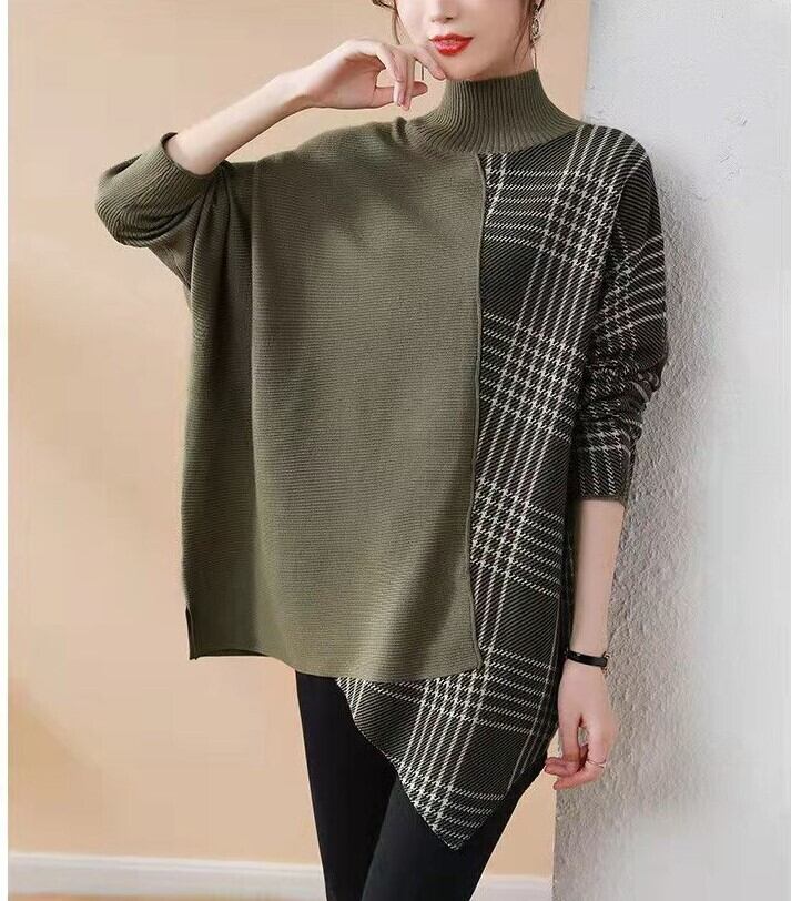 チェック柄 トップス ニットソー セーター プルオーバー ミディアム丈 長袖 ハイネック ストレート アシンメトリー 切り替えデザイン ニット かわいい 大人可愛い きれいめ シンプル カジュアル 大人 上品 おしゃれ 大人女子 こなれ感 ラフ 個性的 クール モード系 モダン 抜け感 柄 格子柄 春 秋 20代 30代 40代 レディース ママ 通勤 学生 通学 お出かけ 公園デビュー 休日 着回し 普段使い サイズ M L XL 2XL 3XL 色展開 黒 ブラック 緑 グリーン 茶色 ブラウン