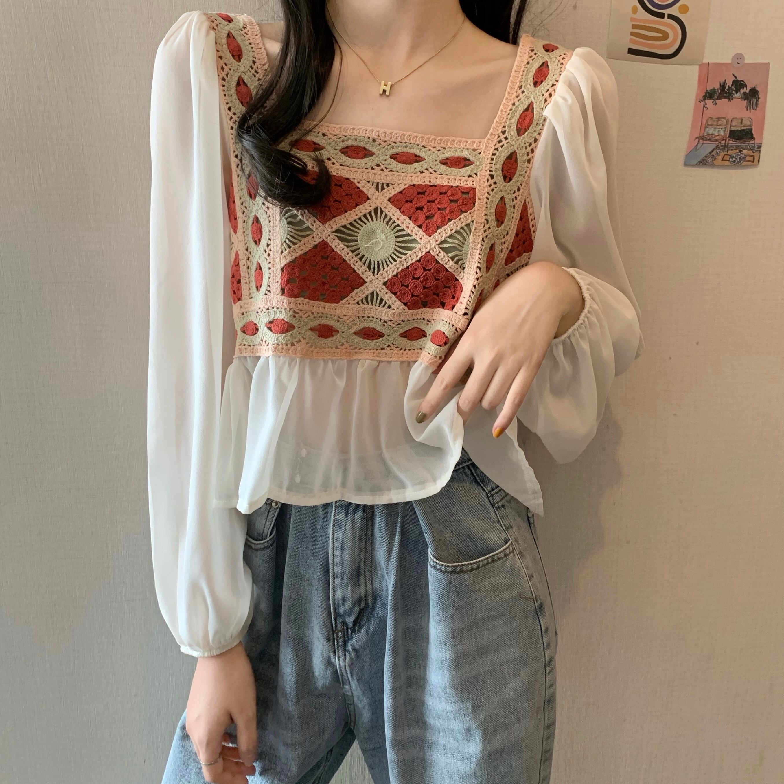 トップス ブラウス ショート丈 長袖 パフスリーブ スクエアネック セミフレア 細身 レース シフォン 編み込み 透け感 かぎ針編み 薄手 かわいい きれいめ カジュアル 上品 おしゃれ お洒落 レトロ こなれ感 ラブリー キュート ルーズ 個性的 エレガント 秋 冬 誕生日 10代 女性用 学生 通学 デート お出かけ 女子会 お泊まり 休日 パーティー イベント リゾート 旅行 高原 ホテル ガーデン ショッピング コーデ モテ ギフト 新作 インスタ映え フレンチ ワンサイズ 赤 カーキ