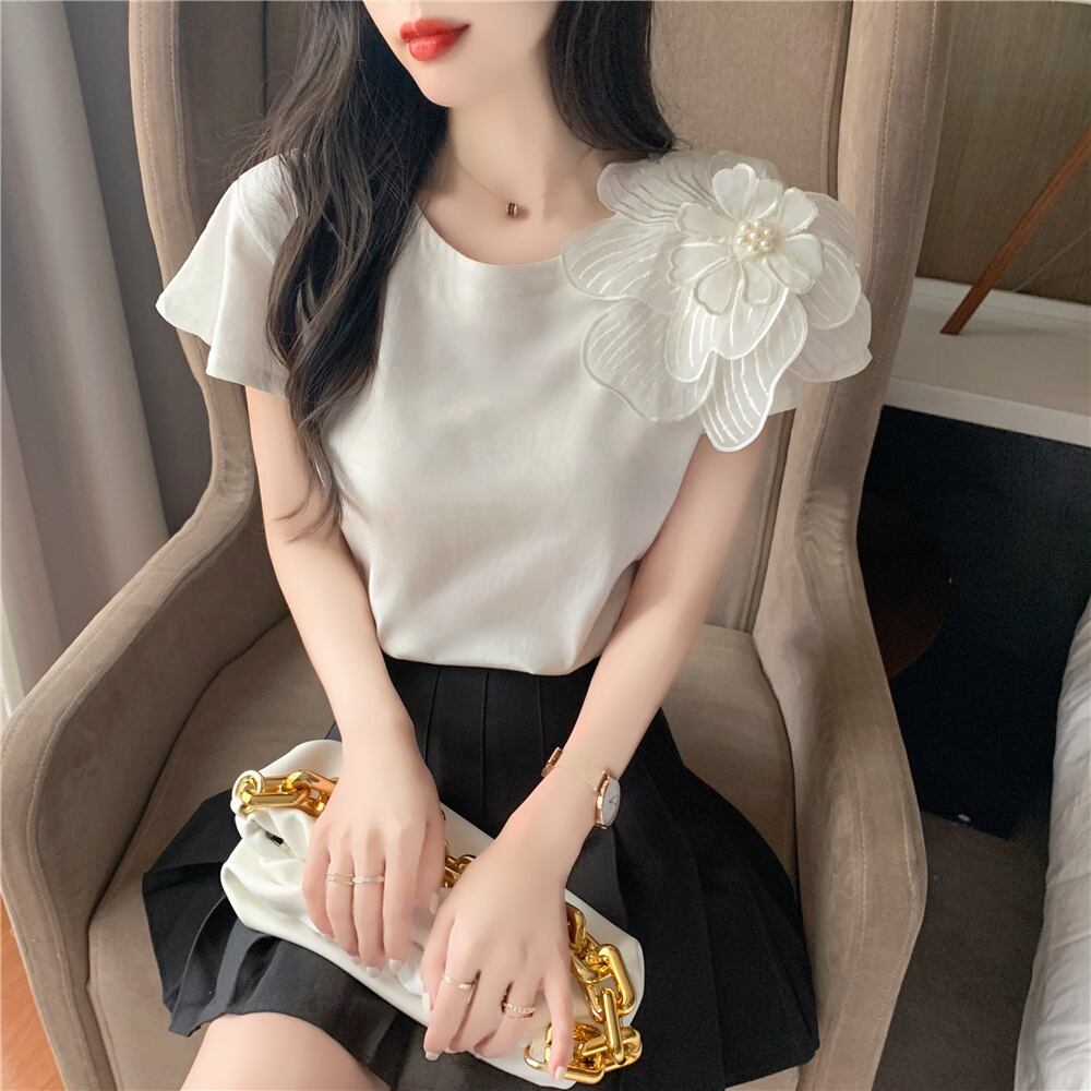 フェミニンコーデ 花飾り ホワイト 大きいサイズ 小さいサイズ トップス シャツ カットソー 白シャツ 白トップス 袖あり 半袖 ラウンドネック 襟なし チュール かわいい 大人可愛い きれいめ 大人 上品 おしゃれ お洒落 清楚 大人女子 ラブリー キュート ガーリー エレガント 存在感 フォーマル 無地 フラワー 春 夏 秋 入学式 入園式 卒業式 卒園式 ロングシーズン 10代 20代 30代 レディース 女性用 ママ デート お出かけ 女子会 休日 パーティー イベント ホテル レストラン