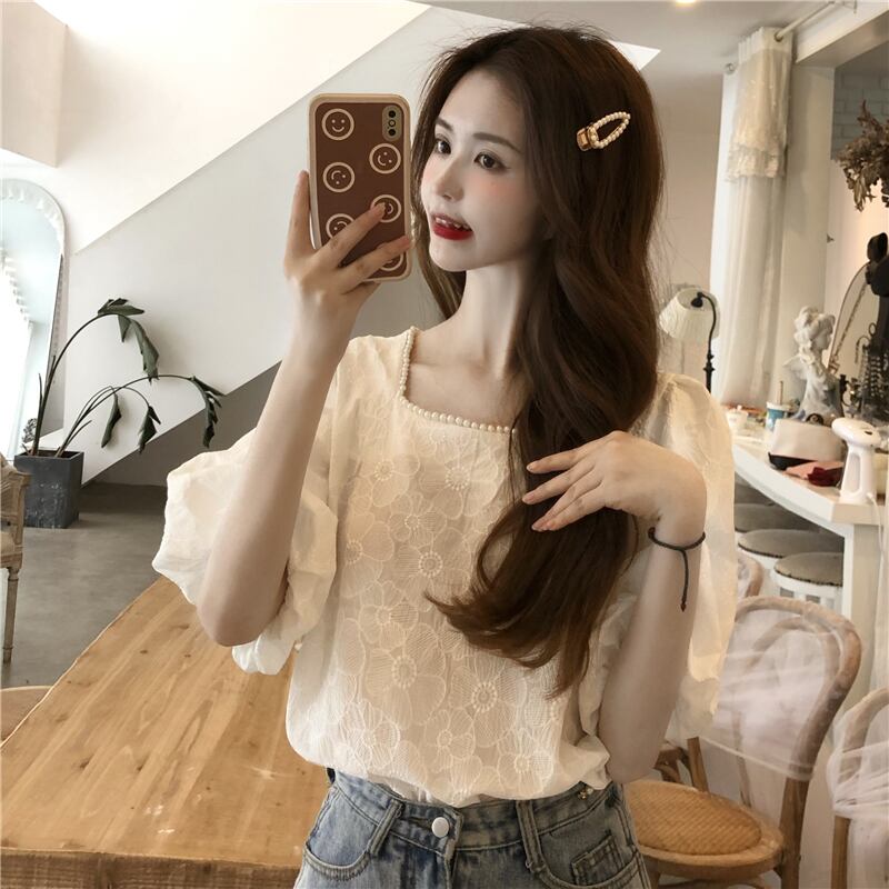 トップス Tシャツ シャツ ブラウス カットソー 白シャツ 白トップス 袖あり 5分袖 五分袖 ボリューム袖 スクエアネック 襟なし 刺繍 かわいい 大人可愛い きれいめ 大人 上品 おしゃれ お洒落 清楚 大人女子 ラブリー キュート ガーリー 存在感 ナチュラル 爽やか 柄 春 夏 秋 ロングシーズン 10代 20代 30代 レディース 女性用 ママ 女の子 学生 デート お出かけ 女子会 休日 イベント レストラン お茶会 ランチ ショッピング 着回し 普段使い 重ね着 韓国 韓国系 オルチャン