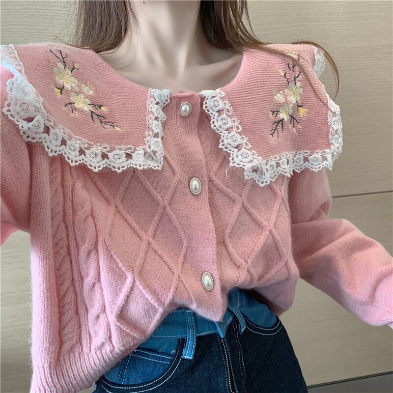 学生風 個性的 トップス カーディガン 袖あり 長袖 萌袖 Uネック ラウンドネック 襟付き スリム ストレート スマート レース 刺繍 フリル 前開き ケーブルニット 編み込み 伸縮性 かわいい カジュアル おしゃれ レトロ アジアン こなれ感 ラフ ラブリー キュート ガーリー 抜け感 カレッジスタイル フェアリー 妖精 無地 柄 花柄 小花柄 フラワー 秋 冬 学生 通学 デート お出かけ 着回し 普段使い 重ね着 ファッション コーデ スタイル S M L ホワイト ブラック ピンク