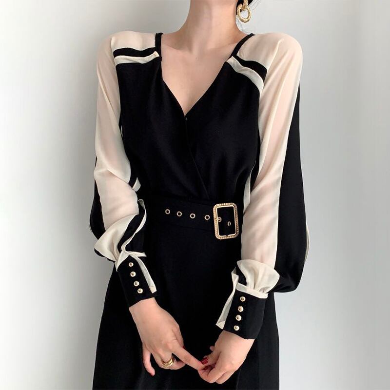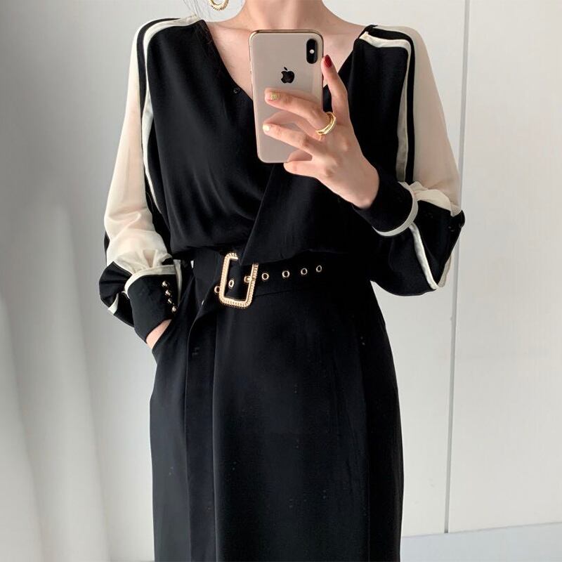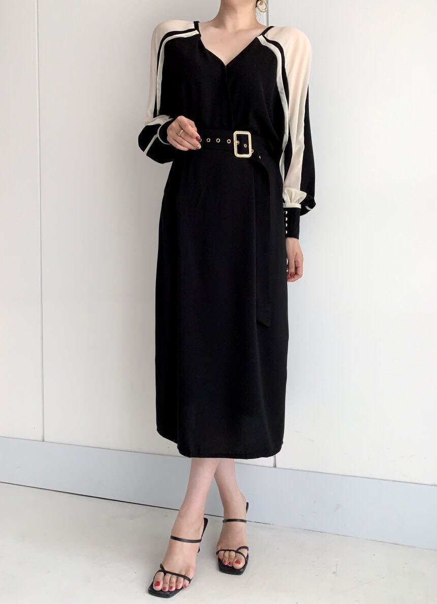 Vネック ワンピース ロングスカート ワンピドレス ミモレ丈 ロング丈 長袖 パフスリーブ ランタンスリーブ カシュクール ストレート Iライン 切り替えデザイン ベルト ウエストマーク スリット 透け感 かわいい 大人可愛い きれいめ 大人 上品 おしゃれ 大人女子 こなれ感 ラブリー キュート クール セクシー とろみ感 無地 春 20代 30代 40代 レディース ママ OL 通勤 デート お出かけ パーティー イベント ホテル 着回し 普段使い モテ 脚長 色展開 黒 ブラック バイカラー
