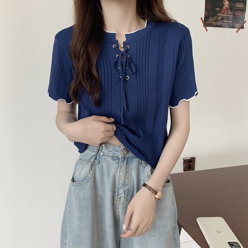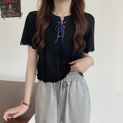 レースアップの襟元が可愛い半袖トップス