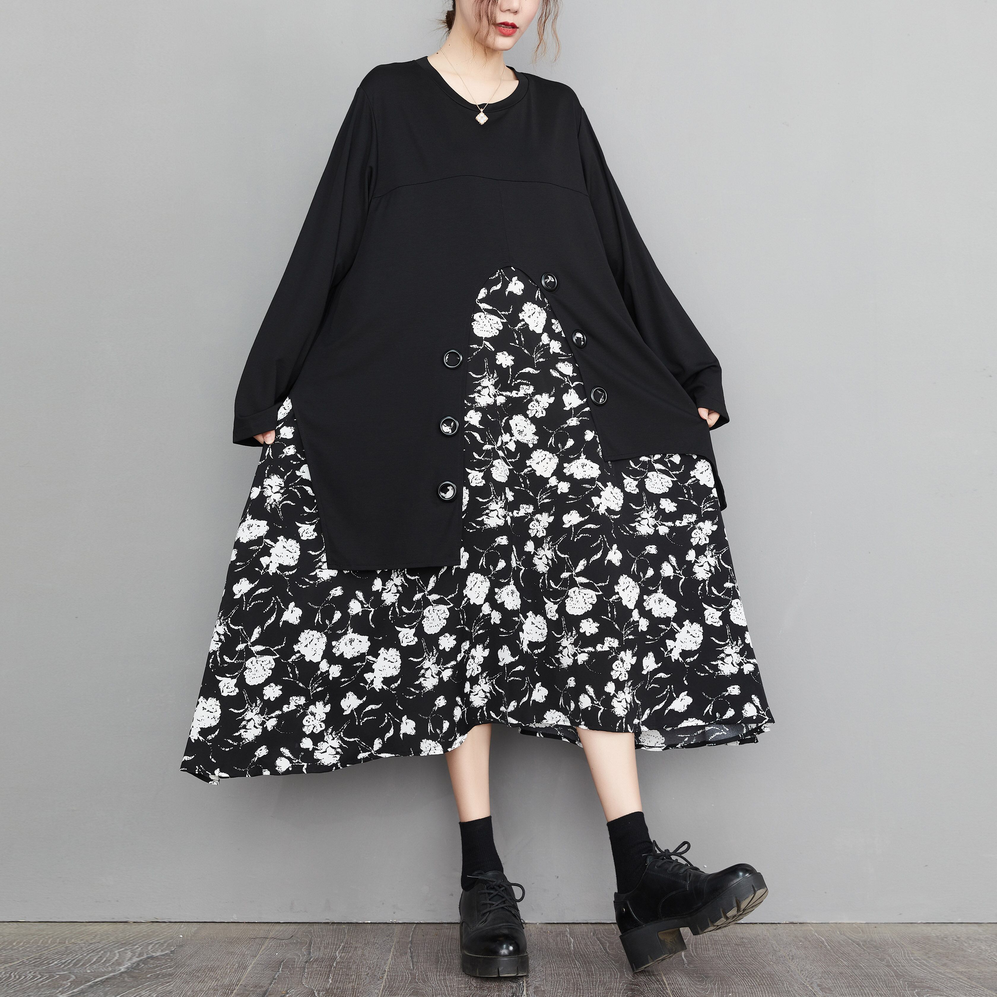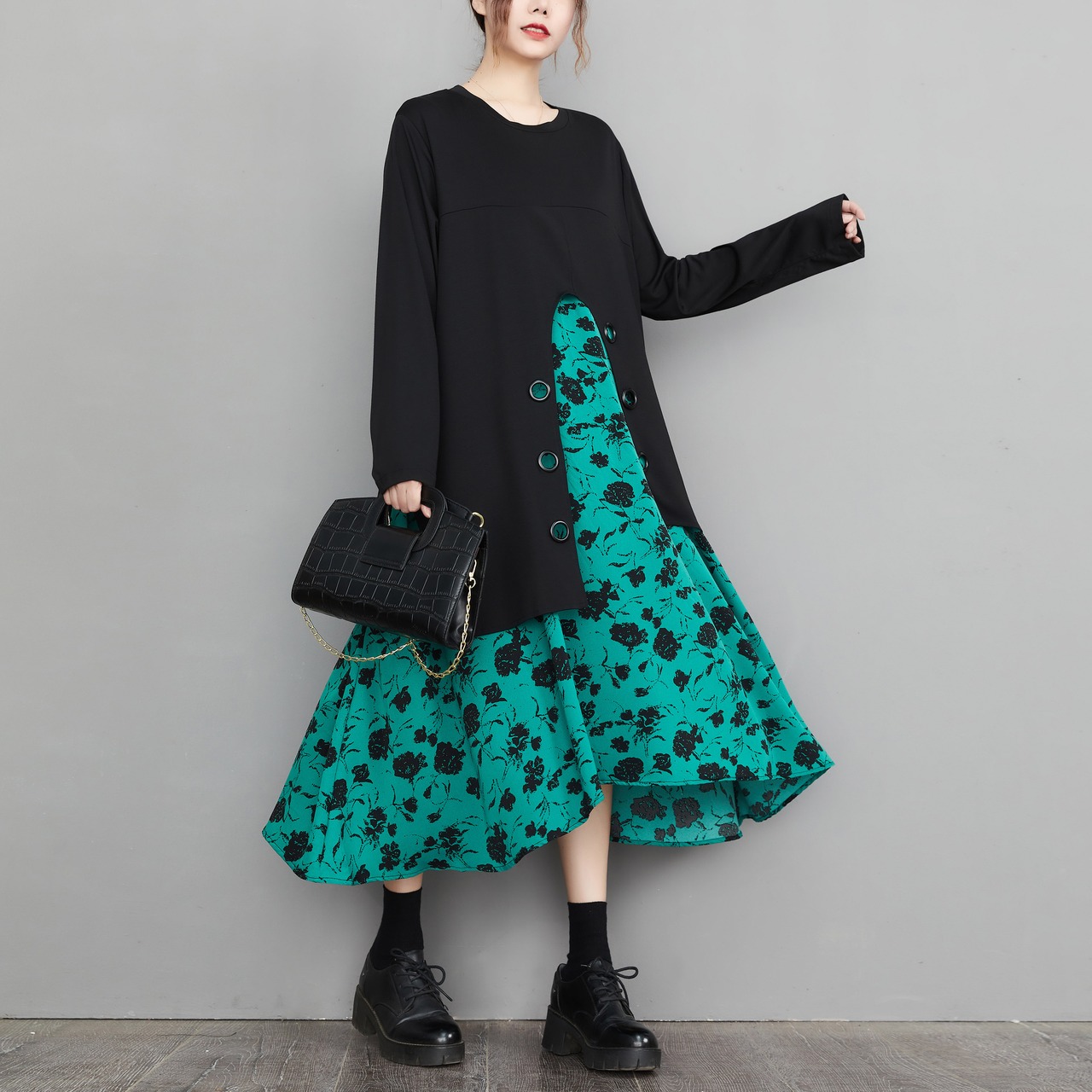 花柄 大きいサイズ フェイクツーピース ワンピース プルオーバー ロングスカート ミモレ丈 ロング丈 長袖 ラウンドネック ワイド Aライン アシンメトリー 切り替えデザイン かわいい 大人可愛い カジュアル 大人 おしゃれ 大人女子 こなれ感 ラフ ルーズ 個性的 存在感 抜け感 柄 フラワー プリント 秋 冬 20代 30代 レディース ママ マタニティ 学生 通学 デート お出かけ 女子会 休日 着回し 普段使い 重ね着 楽ちん モテ サイズ L XL 大きいサイズ ゆったり ゆる 色展開 黒 緑