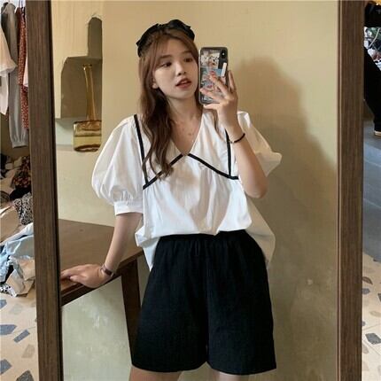 バイカラートップス ホワイト ブラック 大きいサイズ 小さいサイズ トップス シャツ ブラウス カットソー 白シャツ 白トップス 袖あり 半袖 パフスリーブ Vネック 襟なし かわいい おしゃれ お洒落 清楚 ラブリー キュート ガーリー 個性的 存在感 抜け感 無地 春 夏 秋 ロングシーズン 10代 20代 30代 レディース 女性用 女の子 学生 デート お出かけ 女子会 休日 イベント お茶会 ランチ ショッピング 着回し 普段使い 韓国 韓国系 オルチャン モテ 体系カバー S M L XL