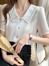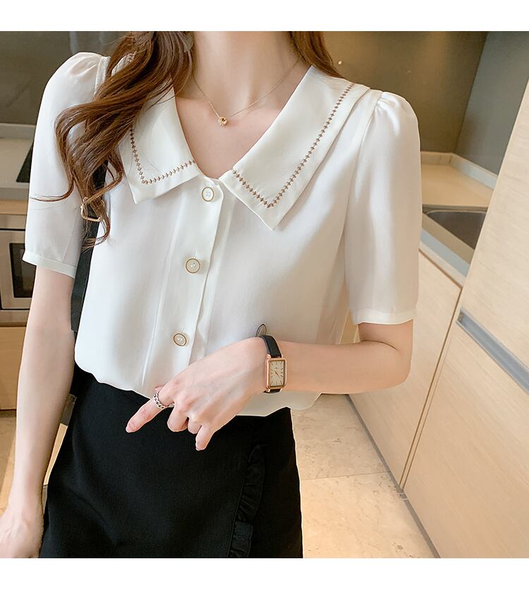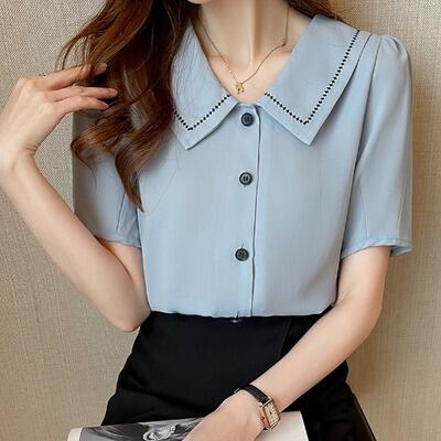 レディース トップス ブラウス シャツ 襟付きシャツ シフォントップ 半袖 ホワイト ブルー TS11749
