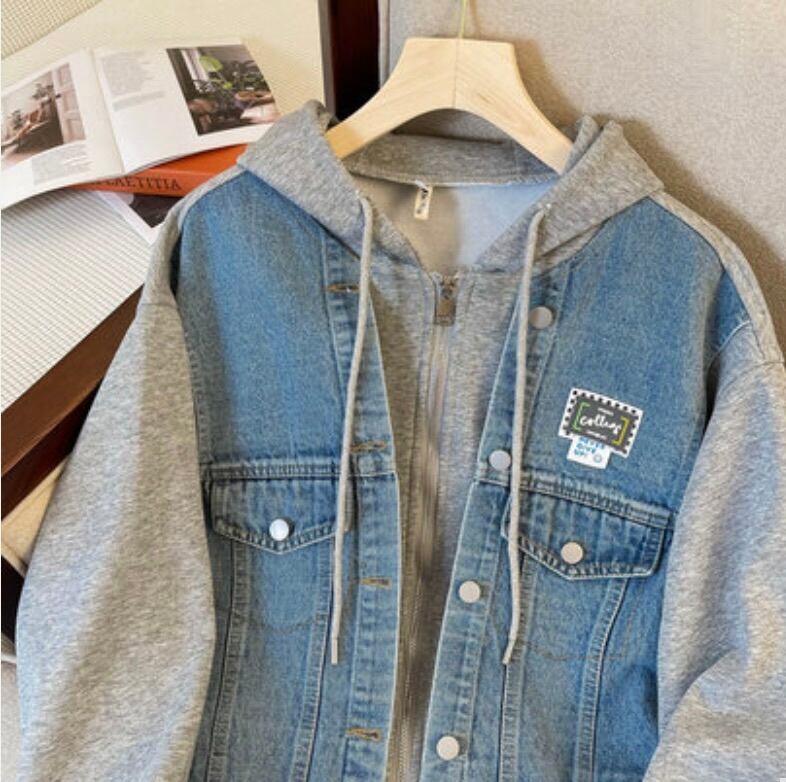デニム縫い合わせデザインのパーカー。