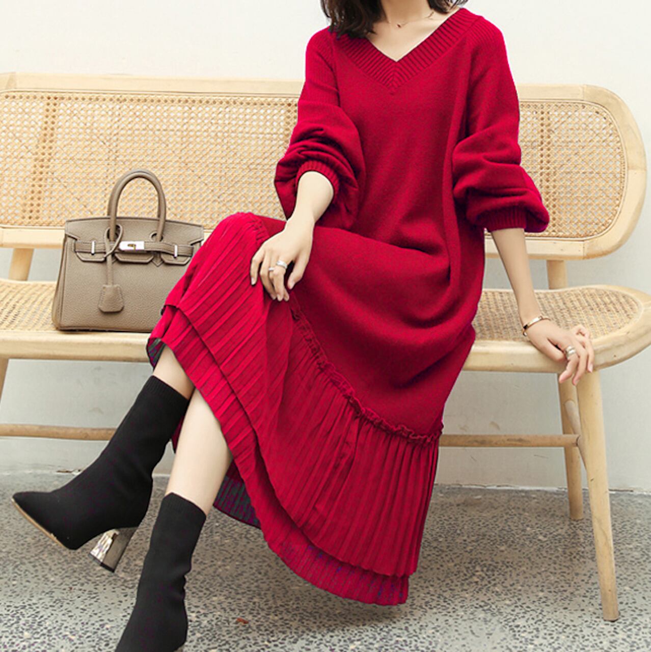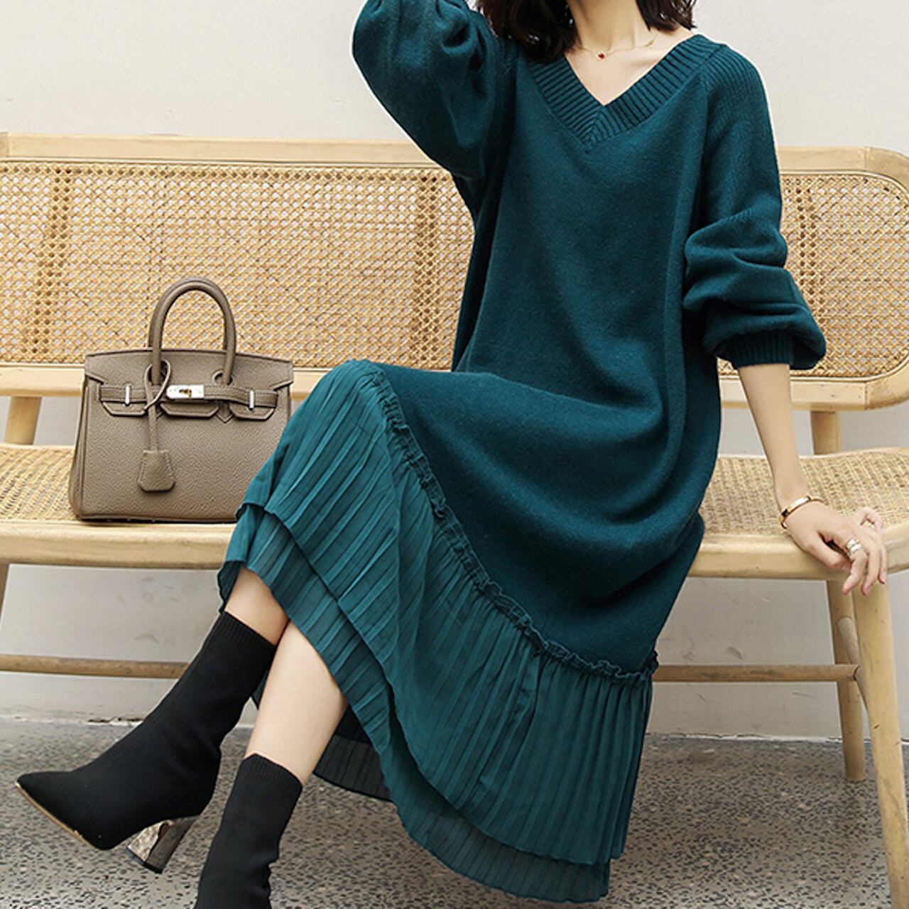 ワンピース ニットソー セーター プリーツスカート ミモレ ミモレ丈 長袖 ボリューム袖 Vネック フレア ワイド Aライン プリーツ ニット かわいい 大人可愛い きれいめ シンプル カジュアル 大人 上品 おしゃれ お洒落 かっこいい レトロ アジアン 大人女子 こなれ感 ラフ ルーズ 抜け感 無地 秋 10代 20代 30代 40代 50代 60代 レディース ママ デート お出かけ 公園デビュー 女子会 休日 韓国 韓国系 オルチャン ファッション コーデ スタイル 楽ちん モテ 体系カバー 定番