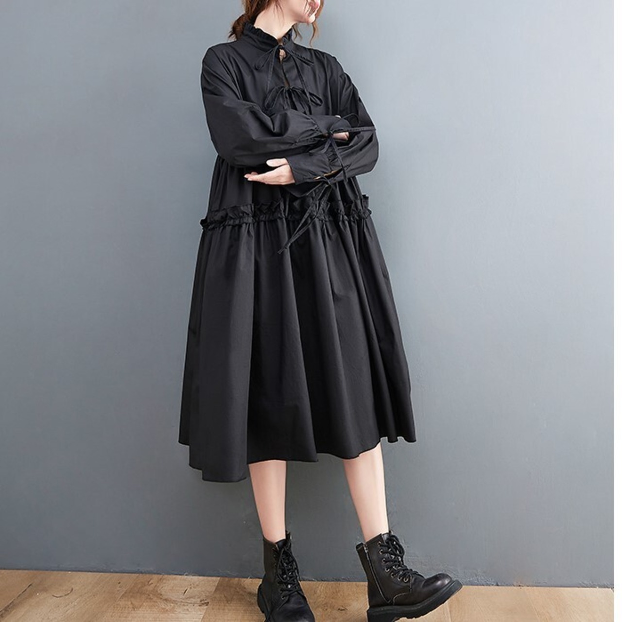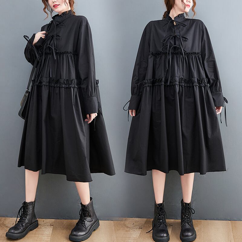 ゆったり シャツ ワンピース ロングスカート シャツワンピース ティアードワンピース ワンピドレス ロング ロング丈 ミディアム丈 長袖 スタンドカラー ワイド 切り替えデザイン フリル リボン かわいい 大人可愛い カジュアル おしゃれ こなれ感 ラフ ラブリー キュート ガーリー ルーズ 無地 春 秋 冬 10代 20代 レディース ママ マタニティ 学生 通学 デート お出かけ 公園デビュー 女子会 着回し 普段使い 楽ちん モテ サイズ L XL 大きいサイズ ゆる サイズ 色展開 黒 ブラック