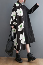 ワンピース シャツ ロングスカート シャツワンピース ロング丈 長袖 シャツスリーブ 襟付き ポロカラー ワイド 前開き 上品 お洒落 かっこいい 大人女子 ルーズ 個性的 クール 存在感 柄 フラワー 春 秋 誕生日 母の日 20代 30代 レディース 女性用 ママ OL 通勤 デート お出かけ 女子会 お泊まり 休日 パーティー イベント リゾート 旅行 高原 ホテル ガーデン レストラン ショッピング ファッション モテ 体系カバー ギフト トレンド インスタ映え L ゆる ワンサイズ 黒