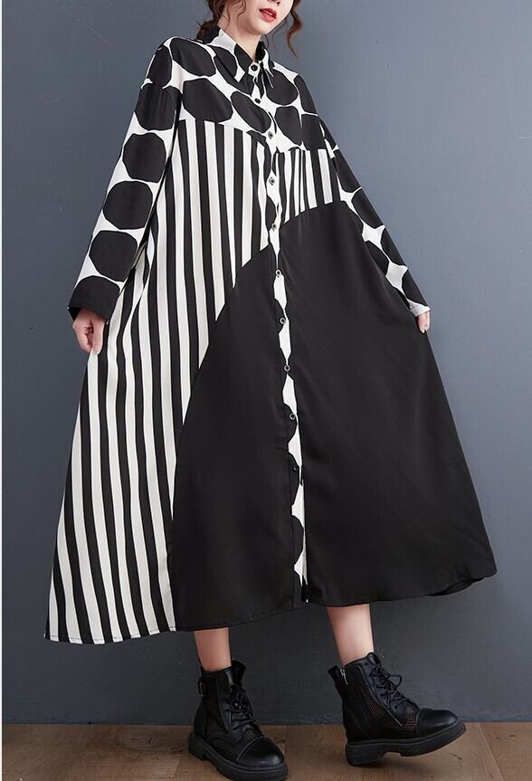 ドット柄 ストライプ ワンピース ロングスカート シャツワンピース ワンピドレス ミモレ丈 ロング丈 長袖 襟付き ワイド アシンメトリー 切り替えデザイン 前開き かわいい 大人可愛い カジュアル おしゃれ お洒落 こなれ感 ラフ キュート ルーズ 個性的 モード系 モダン 存在感 抜け感 水玉 ボーダー 春 秋 冬 10代 20代 30代 レディース ママ マタニティ 学生 通学 デート お出かけ 公園デビュー 女子会 休日 着回し 普段使い 楽ちん 体系カバー インスタ映え ゆったり ゆる サイズ