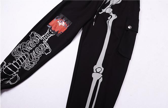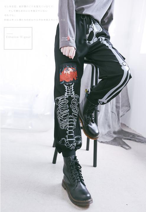 スケルトンのデザインに病み可愛い目玉と真っ赤な花柄が人目を引くパンツです。