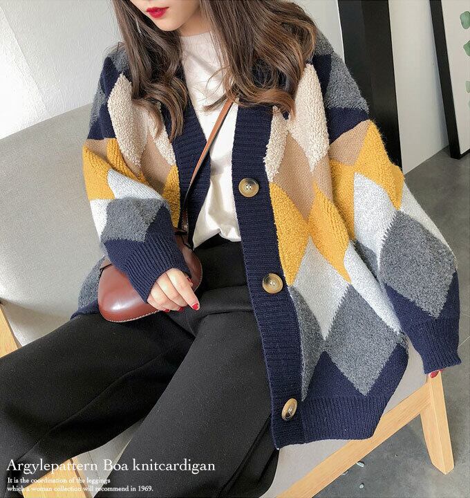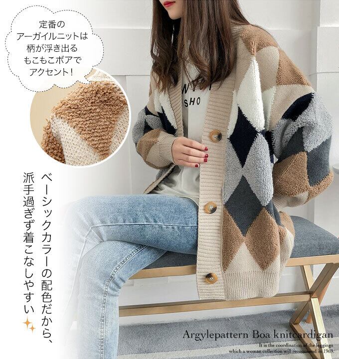 レディース トップス アーガイル柄 ボアニット カーディガン TS12948