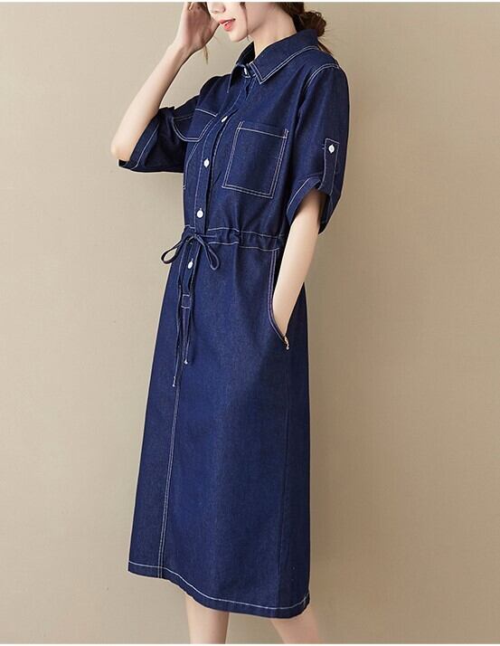 デニム ワンピース ロングスカート シャツワンピース デニムワンピース ミモレ ミモレ丈 ロング ロング丈 半袖 五分袖 襟付き ストレート ウエストマーク ウエストリボン バックスリット かわいい 大人可愛い きれいめ シンプル カジュアル おしゃれ 大人女子 こなれ感 ラフ キュート ルーズ 存在感 抜け感 無地 春 夏 10代 20代 30代 レディース 学生 通学 デート お出かけ 公園デビュー 女子会 休日 着回し 普段使い 重ね着 楽ちん モテ サイズ M L XL 2XL 色展開 青 ブルー