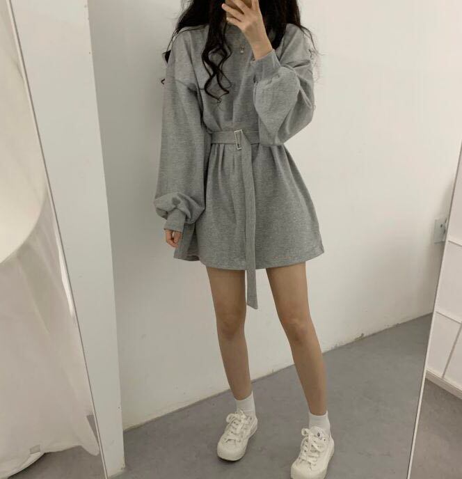 ベルトウエストマーク ワンピース ミニ丈 ショート 長袖 かわいい おしゃれ レトロ 大人可愛い キュート ガーリー 通勤 通学 デート 韓国系 ファッション 黒 ブラック 灰色 グレー AS10079