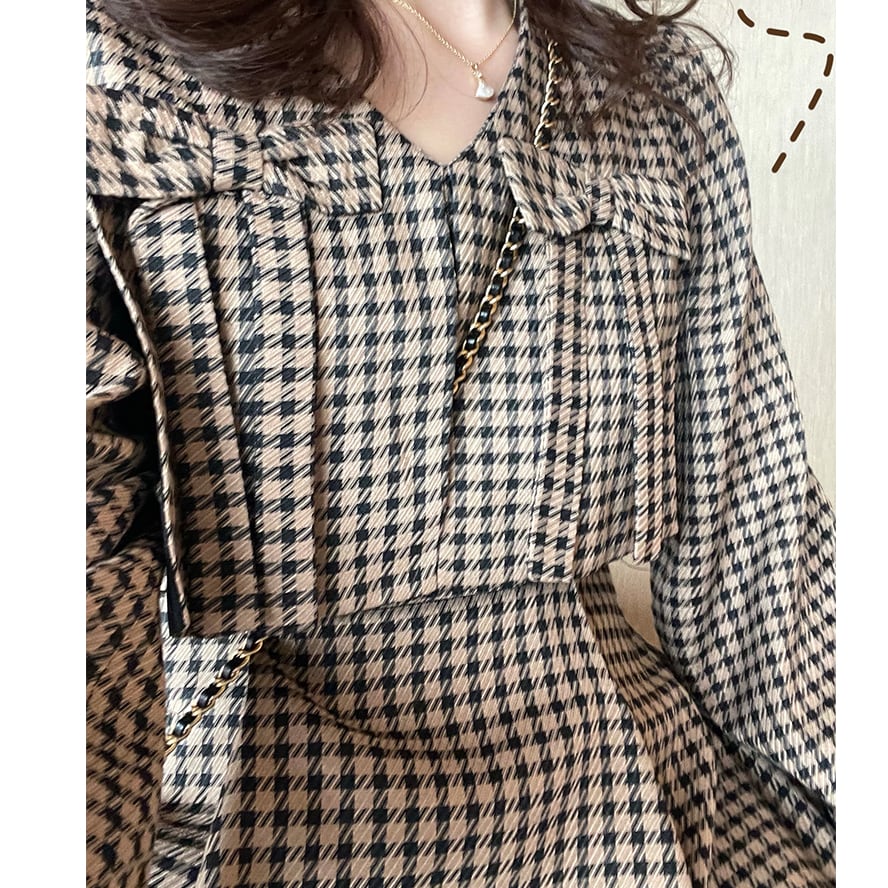 ワンピース 膝丈 ひざ丈 長袖 きれいめ 上品 お洒落 レトロ 大人可愛い 主役級 チェック柄 秋 冬 通勤 通学 デート お出かけ 韓国系 オルチャン 茶色 ブラウン AS10086