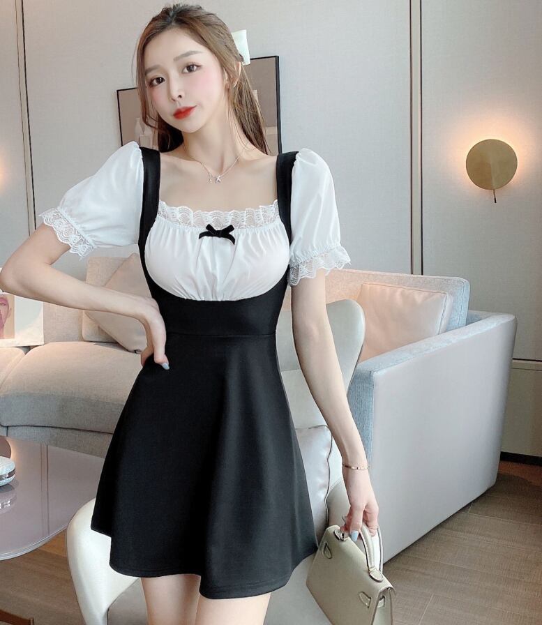 ワンピース ミニ丈 半袖 かわいい おしゃれ レトロ 大人可愛い ラブリー キュート セクシー デート お出かけ 韓国系 ファッション S M L XL 黒 AS10092