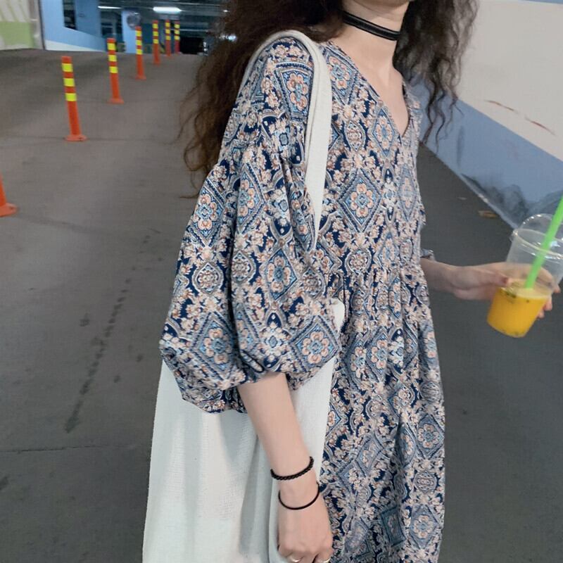 ルーズワンピース 花柄ロングワンピース スカート ワンピース プルオーバー ロングスカート フレアスカート 膝下 ロング ロング丈 マキシ マキシ丈 9分丈 アンクル丈 袖あり 半袖 5分袖 五分袖 7分袖 七分袖 ボリューム袖 パフスリーブ Vネック フレア ワイド Aライン シフォン ハイウエスト 薄手 かわいい 大人可愛い カジュアル 大人 上品 おしゃれ お洒落 レトロ 大人可愛い 大人女子 こなれ感 ガーリー ルーズ セクシー エレガント 主役級 存在感