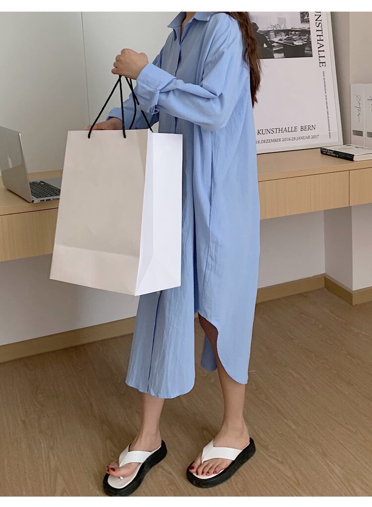 シンプルなデザインで大人な着こなし長袖の開襟シャツワンピース