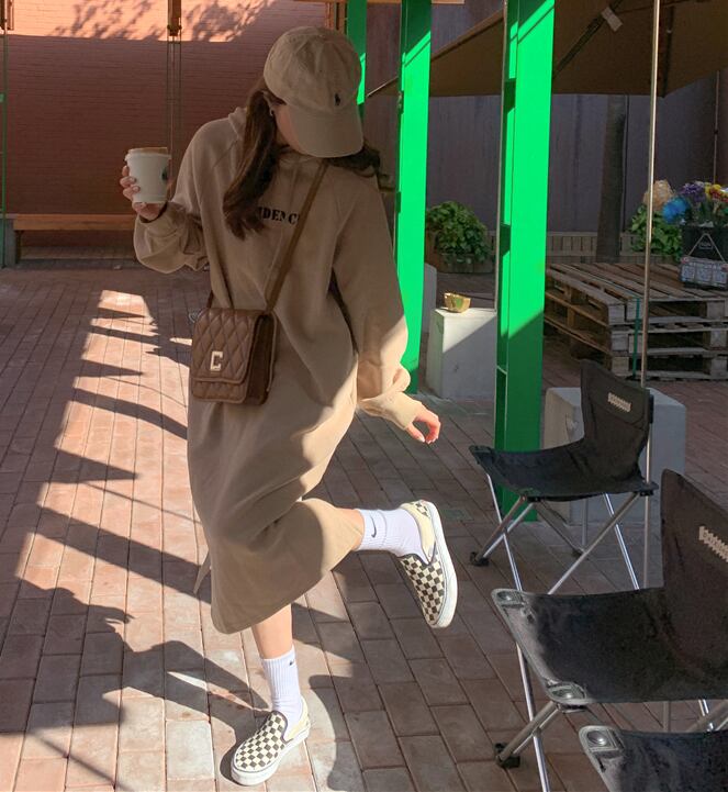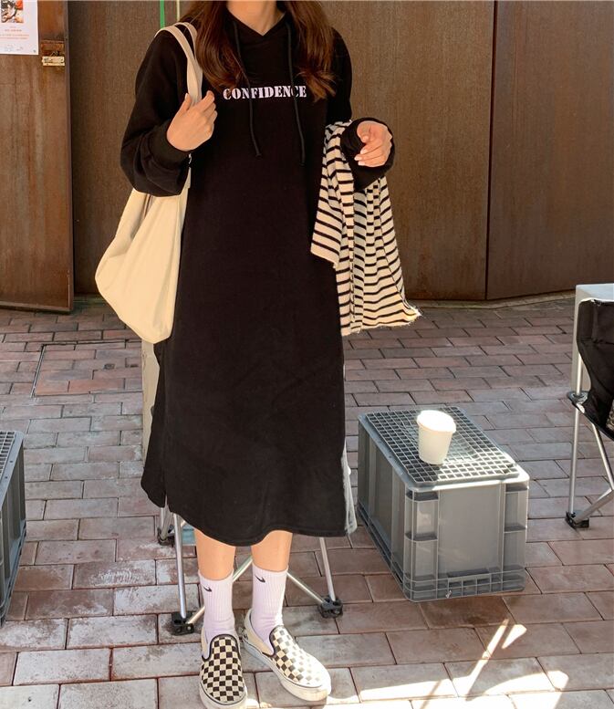 ワンピース パーカー サイドスリット ロング丈 マキシ丈 長袖 フード付き カジュアル 大人可愛い こなれ感 ラフ メンズライク 抜け感 着回し 普段使い ゆったり 黒 ブラック 灰色 グレー ベージュ AS10097