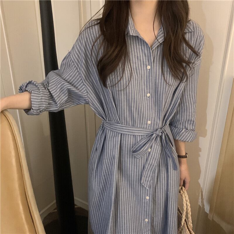ワンピース シャツ ロング丈 長袖 カジュアル おしゃれ ラフ ストライプ 通勤 通学 着回し 普段使い 楽ちん 白 ホワイト 青 ブルー AS10101