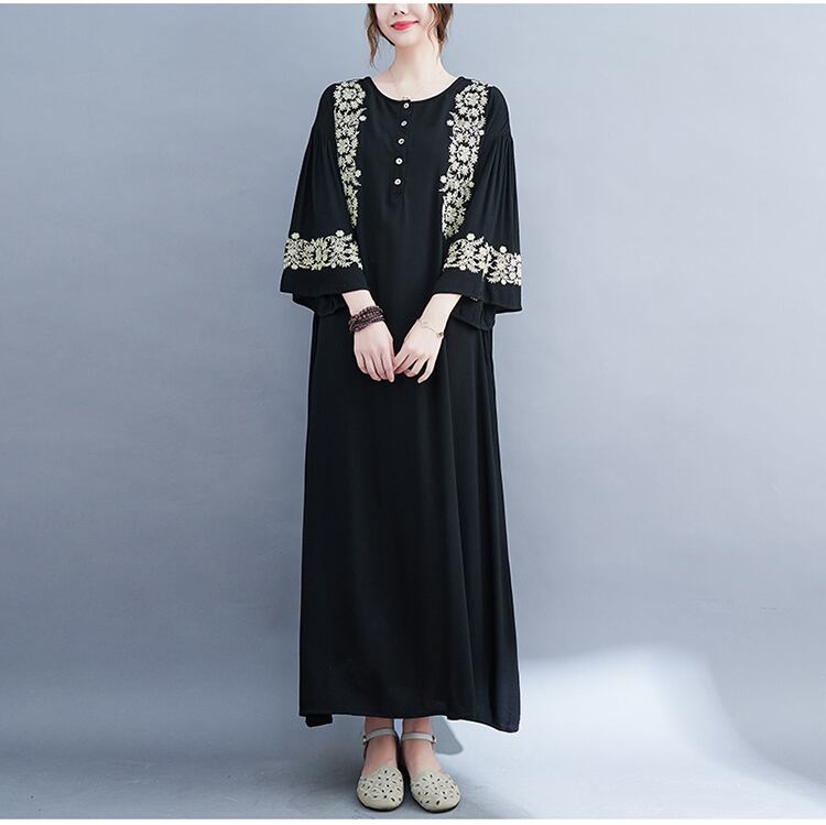 エスニック風ワンピース ブラック ベージュ 大きいサイズ ワンピース ロングワンピース 膝下 ロング ロング丈 袖あり 7分袖 七分袖 ラウンドネック 襟なし ストレート ワイド かわいい シンプル カジュアル おしゃれ お洒落 レトロ アジアン エスニック ラフ ガーリー ルーズ 個性的 存在感 ナチュラル 柄 春 夏 秋 ロングシーズン 10代 20代 30代 レディース 女性用 ママ 女の子 学生 デート お出かけ 女子会 休日 お茶会 ランチ ショッピング 着回し 普段使い L XL ゆったり