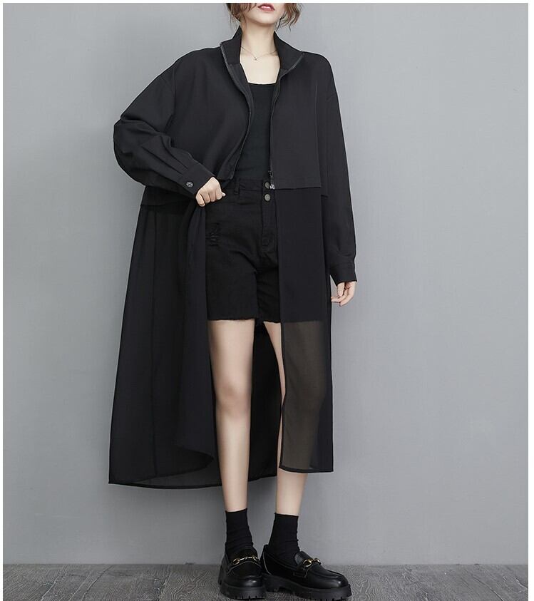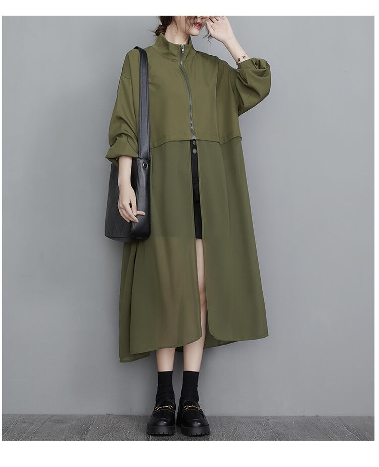 個性的 アウター ブルゾン ジャケット シャンパー ロング ロング丈 ミディアム丈 長袖 スタンドカラー ストレート シフォン ファスナー 透け感 シースルー 薄手 かわいい 大人可愛い きれいめ シンプル カジュアル 大人 上品 おしゃれ かっこいい 大人女子 こなれ感 ラフ クール モード系 モダン 存在感 抜け感 無地 春 秋 10代 20代 30代 レディース 学生 通学 デート お出かけ 公園デビュー 休日 楽ちん モテ 脚長 大きいサイズ ゆったり ゆる サイズ 色展開 黒 ブラック カーキ