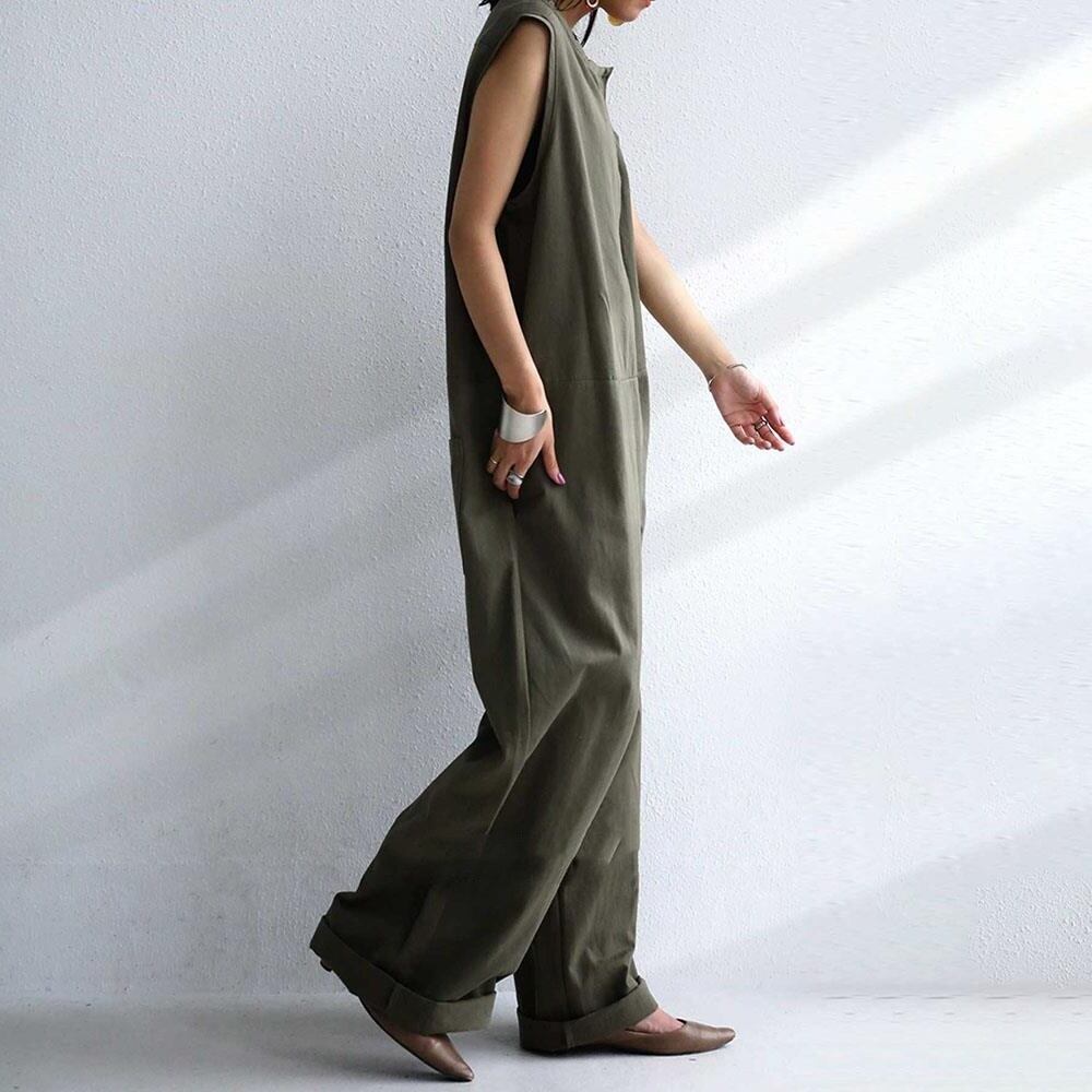 オールインワン サロペット ロング丈 つなぎ ジャンプスーツ ワイドパンツ 袖なし ノースリーブ ラウンドネック 襟なし 切り替えデザイン 前開き 大人可愛い きれいめ シンプル カジュアル 大人 上品 お洒落 かっこいい 大人女子 こなれ感 ラフ マニッシュ 個性的 クール 主役級 抜け感 無地 春 夏 秋 20代 30代 40代 ママ 学生 通学 デート お出かけ 女子会 休日 旅行 着回し 普段使い 重ね着 オルチャン 楽ちん 体系カバー トレンド 流行 インスタ映え ワンサイズ ゆったり カーキ