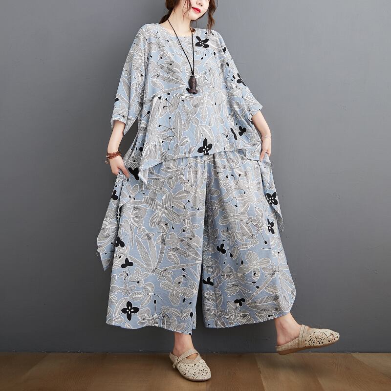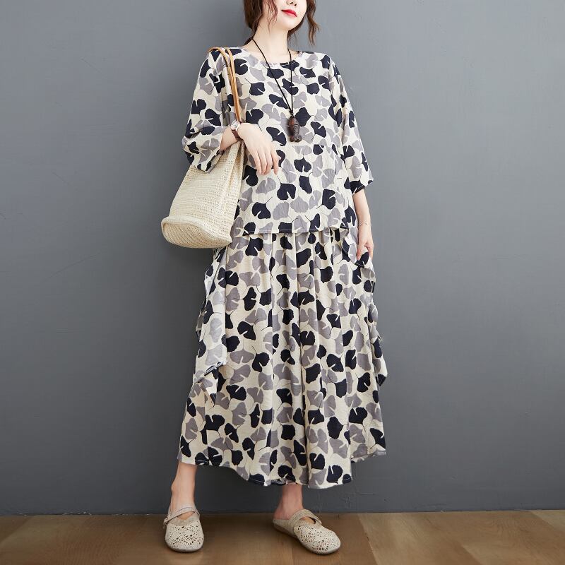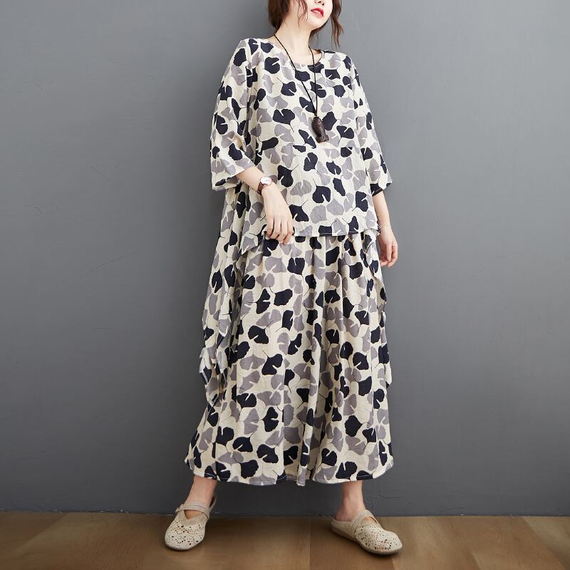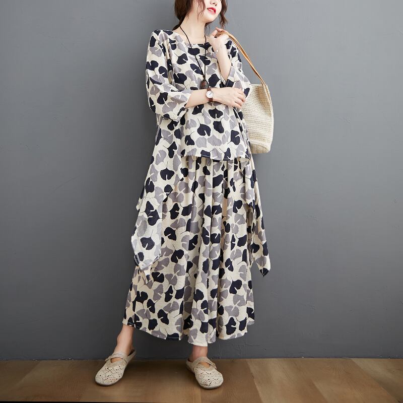 セットアップ プルオーバー ワイドパンツ 膝下 ロング丈 七分袖 フレアスリーブ ラウンドネック フレア ワイド ウエストゴム 薄手 ナイロン ツーピース カジュアル 大人 上品 お洒落 大人女子 こなれ感 ルーズ エレガント 存在感 柄 イチョウ柄 春 秋 誕生日 母の日 20代 30代 40代 レディース OL 通勤 デート お出かけ 女子会 休日 リゾート 旅行 高原 ホテル レストラン ショッピング スタイル 楽ちん ギフト 安い インスタ映え フリーサイズ ゆったり ライトブルー アプリコット