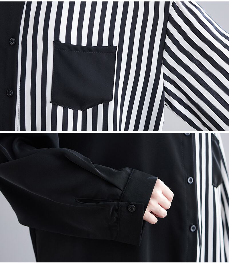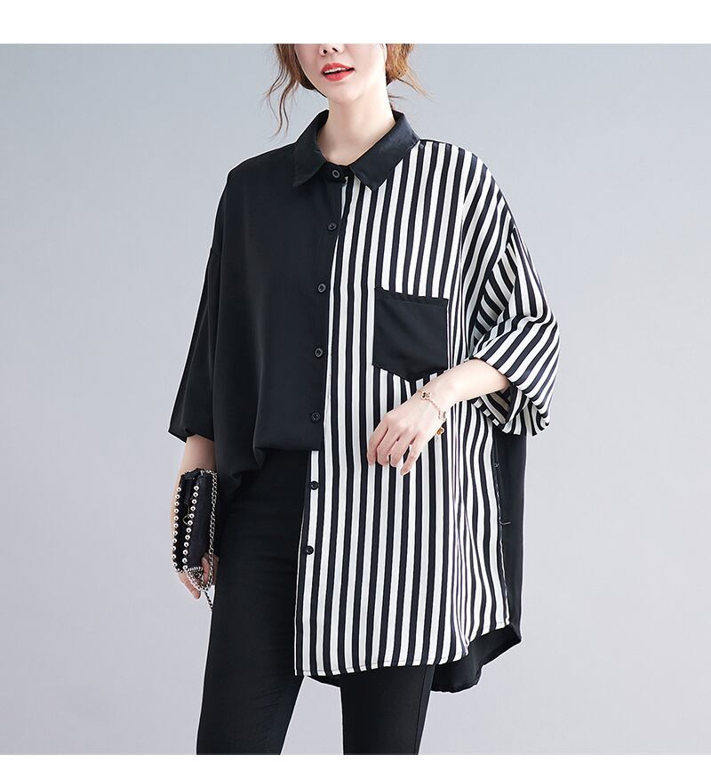 シンプルに着映える個性的で大胆なストライプ×無地のシャツブラウス。