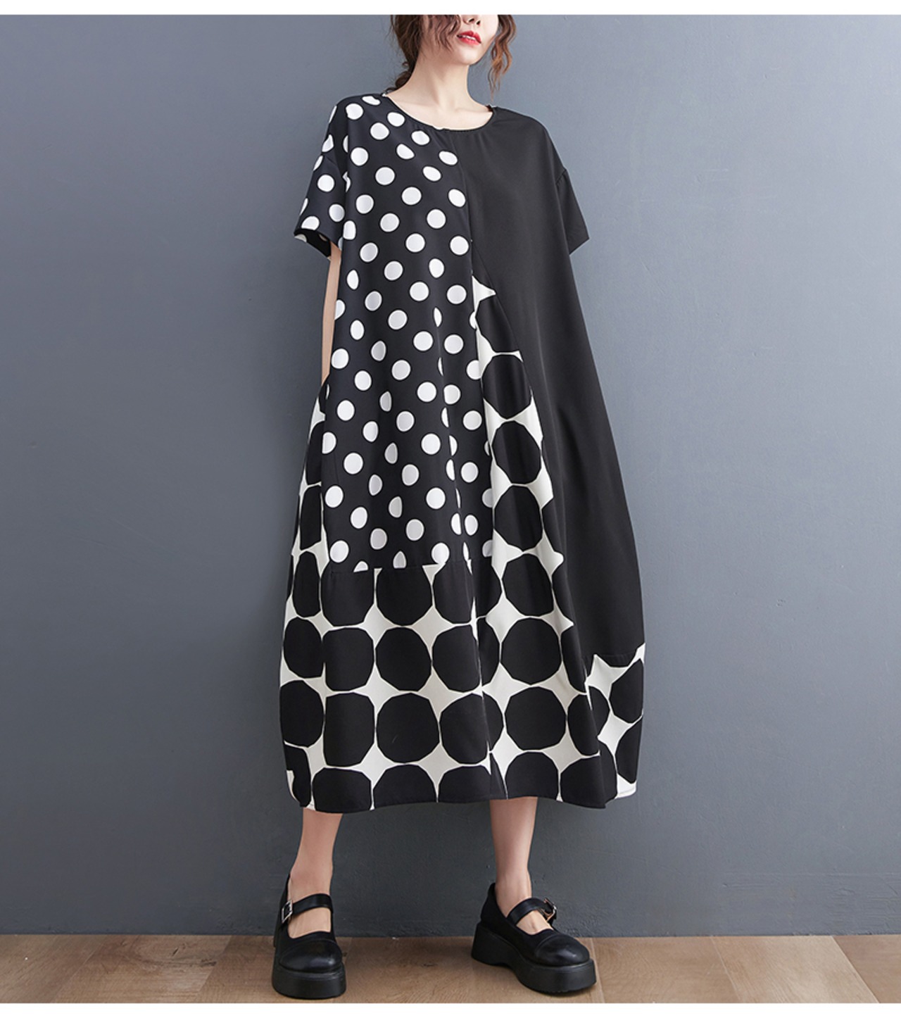 ドット柄ワンピース ブラック ワンピース ロングワンピース 膝下 ロング ロング丈 袖あり 半袖 ドロップショルダー ラウンドネック 襟なし かわいい 大人可愛い 大人 おしゃれ お洒落 レトロ アジアン エスニック ラフ ラブリー キュート ルーズ 個性的 存在感 柄 ドット柄 水玉 春 夏 秋 ロングシーズン 10代 20代 30代 レディース 女性用 ママ マタニティ 女の子 マタニティワンピース 学生 デート お出かけ 女子会 イベント お茶会 ランチ ショッピング 着回し 普段使い 重ね着