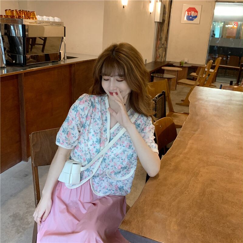 トップス ブラウス ショート ショート丈 袖あり 半袖 Vネック スリム Iライン 前開き ボタン かわいい 大人可愛い きれいめ シンプル カジュアル 大人 上品 おしゃれ お洒落 レトロ 大人女子 こなれ感 ラフ ラブリー キュート ガーリー 主役級 存在感 小花柄 春 夏 10代 20代 30代 レディース ママ オフィス ビジネス OL 通勤 学生 通学 デート お出かけ 公園デビュー 女子会 旅行 着回し 普段使い S M L XL ブルー ピンク