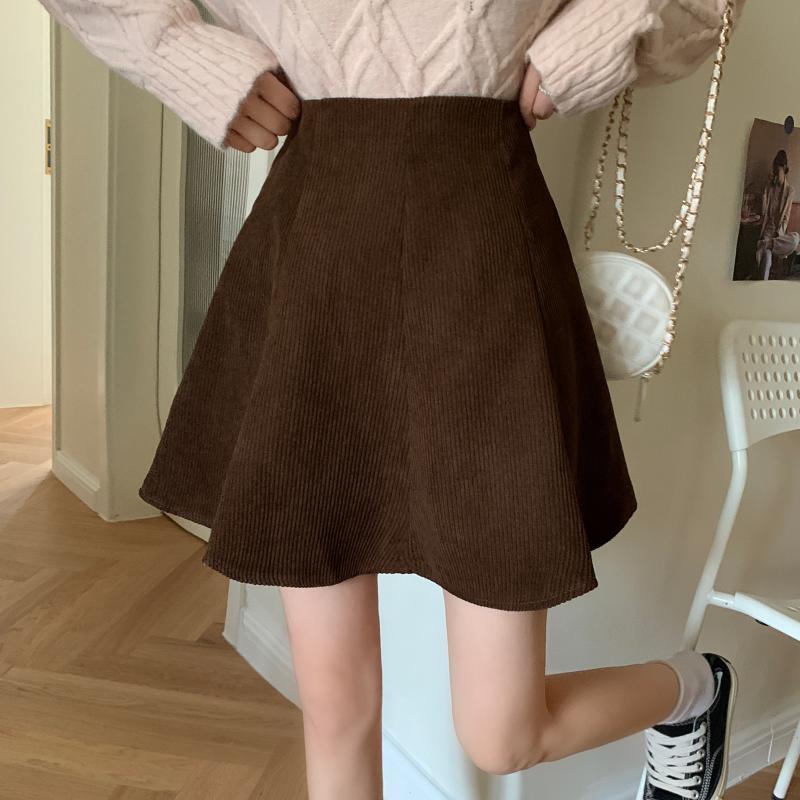 ハイウエスト Aライン コーデュロイ スカート ミニ丈 ショート丈 きれいめ シンプル おしゃれ レトロ 大人可愛い こなれ感 無地 秋 冬 通勤 通学 デート 韓国系 ファッション モテ 脚長 M L XL 2XL 3XL 黒 ブラック 茶色 ブラウン アプリコット AS10118
