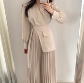 ジャケットとプリーツスカートのフェイクツーピースワンピース。