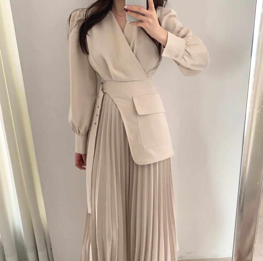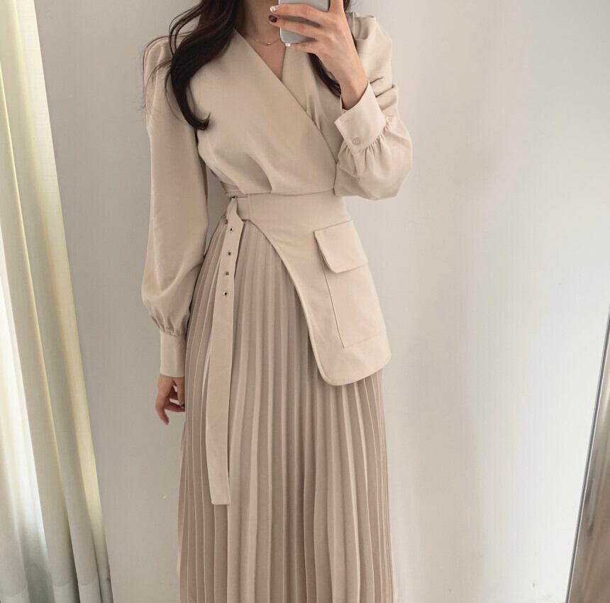 ワンピース ジャケット プリーツスカート ドッキングワンピース ミモレ丈 袖あり 長袖 Vネック 襟なし スリム プリーツ ウエストマーク ポケット ハイウエスト フェイクツーピース 大人可愛い きれいめ シンプル カジュアル 大人 上品 お洒落 大人女子 こなれ感 ラフ エレガント 主役級 抜け感 無地 春 秋 冬 20代 30代 40代 ママ 通勤 通学 デート お出かけ 女子会 休日 旅行 着回し 普段使い 楽ちん モテ 体系カバー 定番 流行 インスタ映え S M L アプリコット ブラック